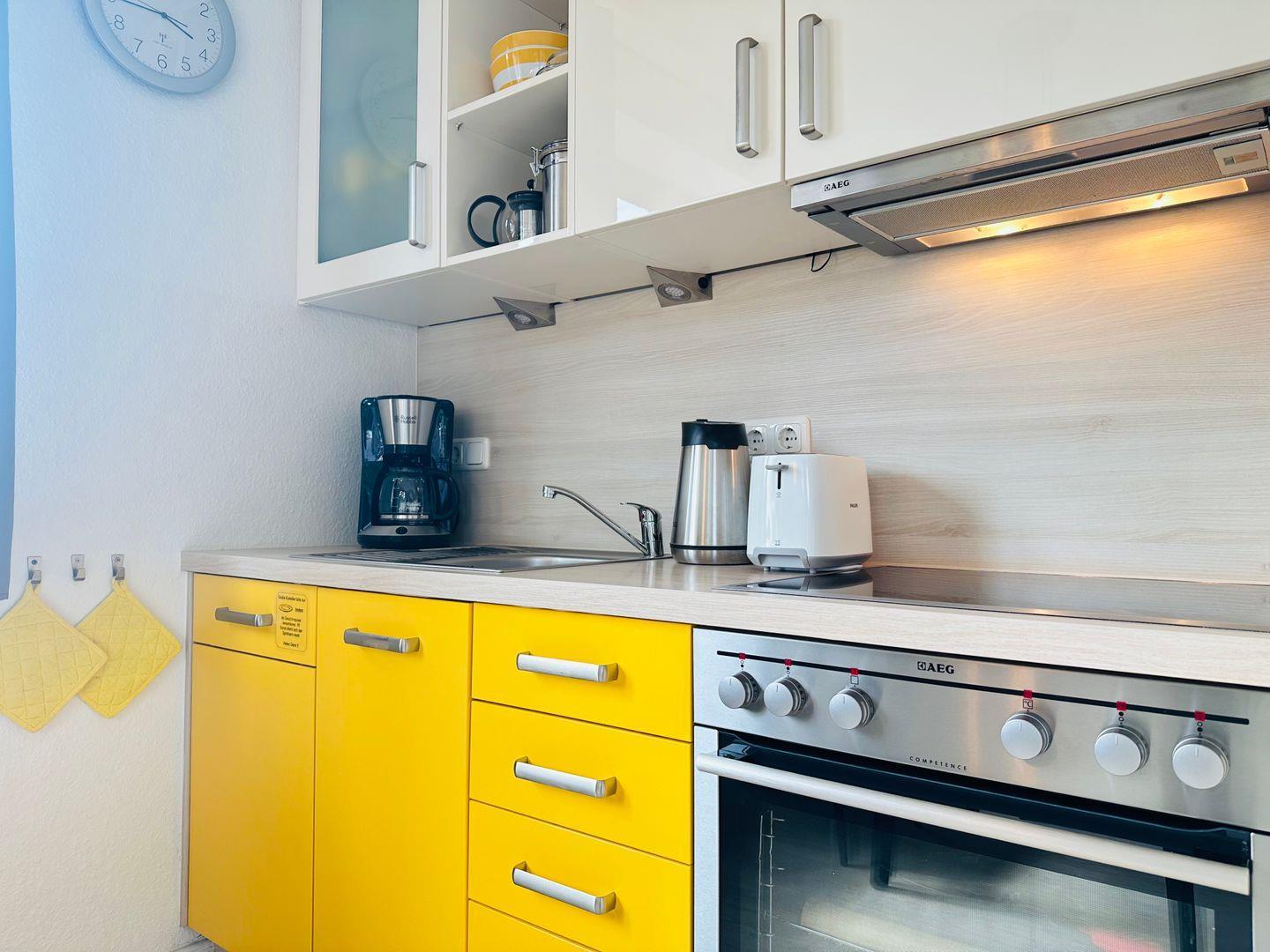 Geschirrspüler, Herd mit Backofen, Kaffeemaschine und Wasserkocher,