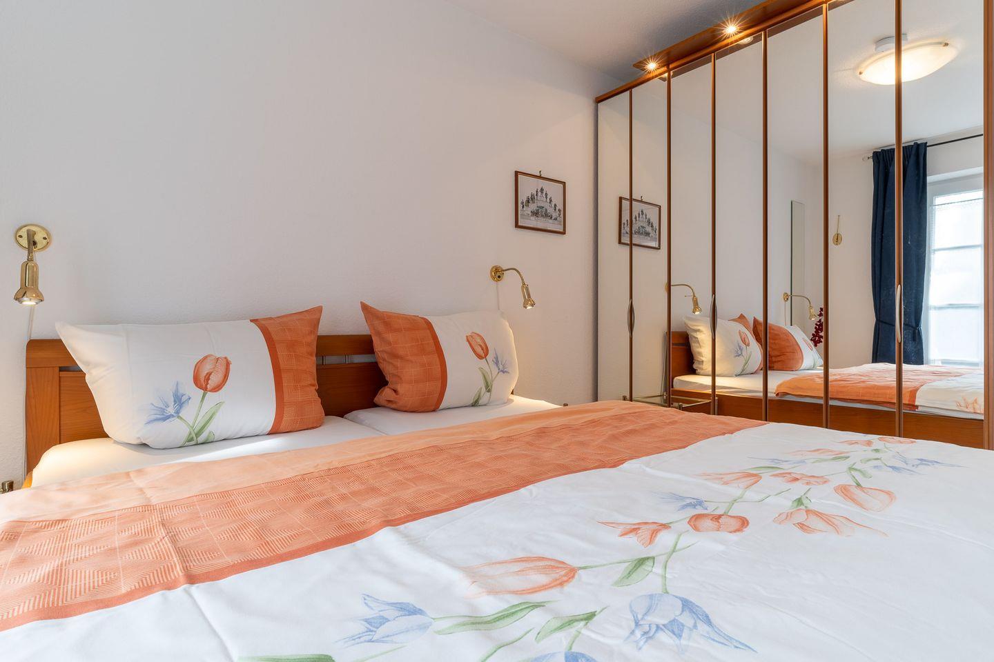 In der perfekt ausgestatteten Küche finden Sie alles, was Sie zum Zubereiten köstlicher Mahlzeiten benötigen, wie Cerankochfeld mit Abluft, Backofen mit Grill, extra leisen Geschirrspüler, Kühlschrank mit Gefrierfach, Mikrowelle, Kaffeemaschine, Kaffeepadmaschine (Senseo), Toaster, Eierkocher, Wasserkocher, Küchenmaschine, Stabmixer und reichlich Küchenutensilien. Das Badezimmer ist mit einem Doppelwaschtisch, einer Dusche mit Glaskabine, einem WC, einem heizbaren Handtuchhalter und einem Fön ausgestattet, um Ihnen den Komfort zu bieten, den Sie von einer 4-Sterne-Wohnung erwarten können. Das Elternschlafzimmer verfügt über ein Doppelbett und der zweite Schlafraum über zwei Einzelbetten, beide mit Bandscheibenmatratzen und waschbaren Deckbetten ausgestattet. Sämtliche Fenster und Terrassentüren sind mit hochwertigen Insektenschutzgittern ausgestattet.