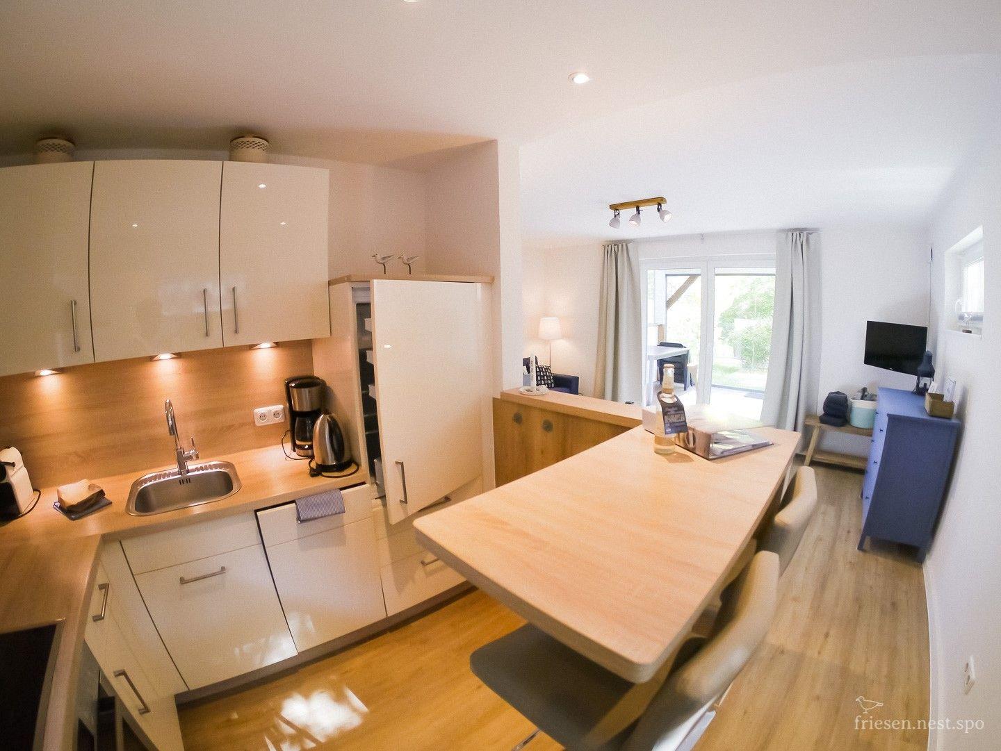 Unsere Fewo (35qm2) liegt im EG mit separatem Eingang. Sie ist ideal für 2 Personen. (Bett 160 x 200 cm ). Die Einrichtung wurde im Rahmen der Sanierung erneuert. Ein großzügiges Bad, eine offene Küche, sowie komfortable Sitzmöbel runden das Angebot ab. Die zwei Terrassen, eine windgeschützt und überdacht, die andere mit Strandkorb im großen ruhigen Gartenanteil laden zum Verweilen ein.