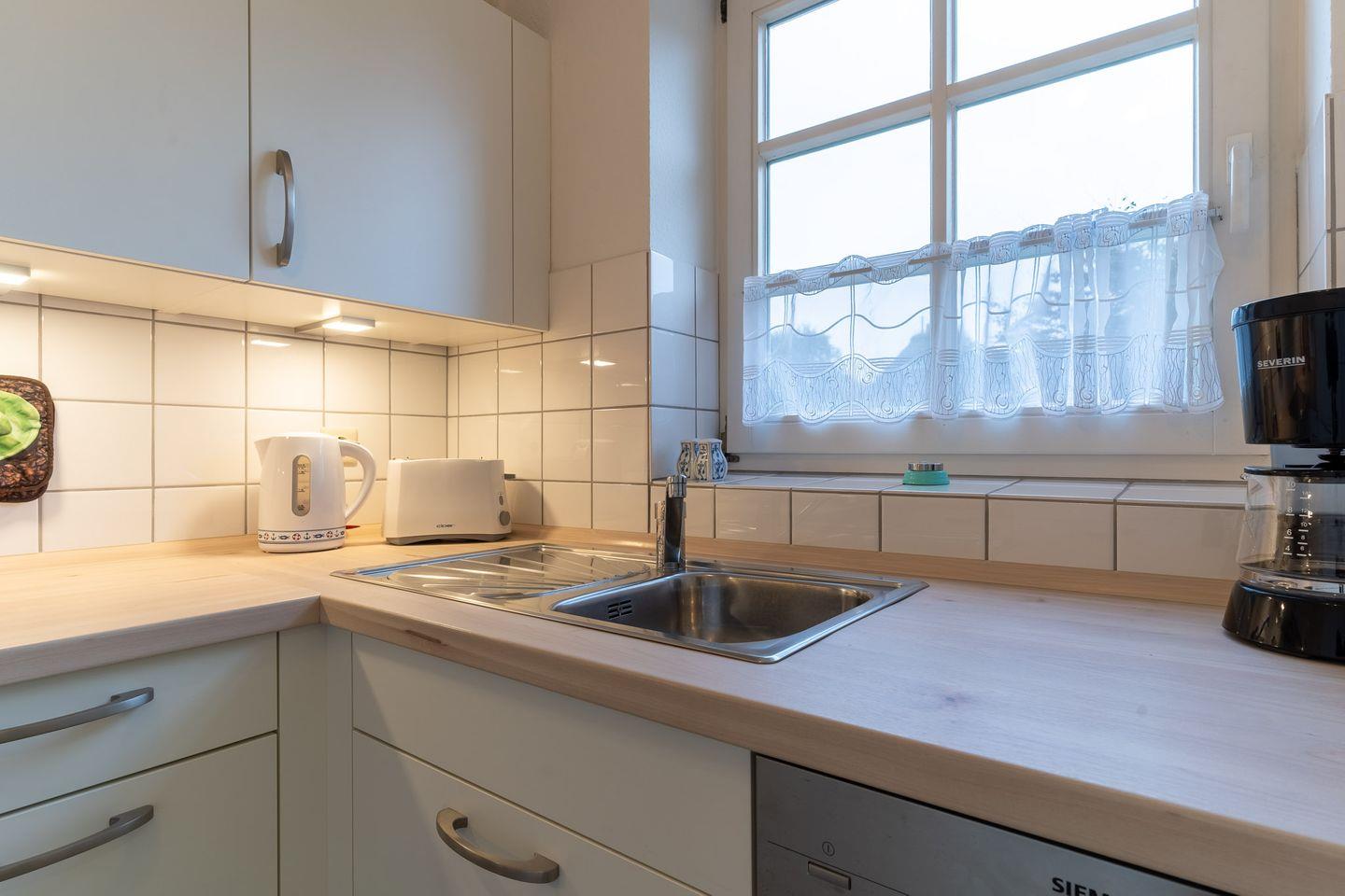 Die separate Küche ist voll ausgestattet mit allen wichtigen Geräten und bietet alles, was Sie zur Zubereitung leckerer Mahlzeiten benötigen. Im Erdgeschoss finden Sie zudem ein praktisches Gäste-WC. Im Obergeschoss befindet sich ein modernes Bad mit Dusche.