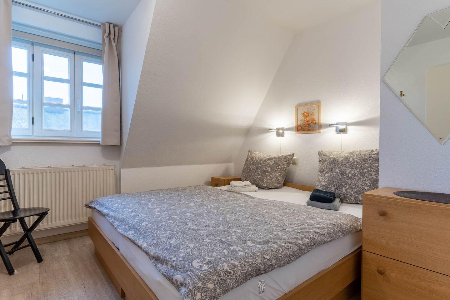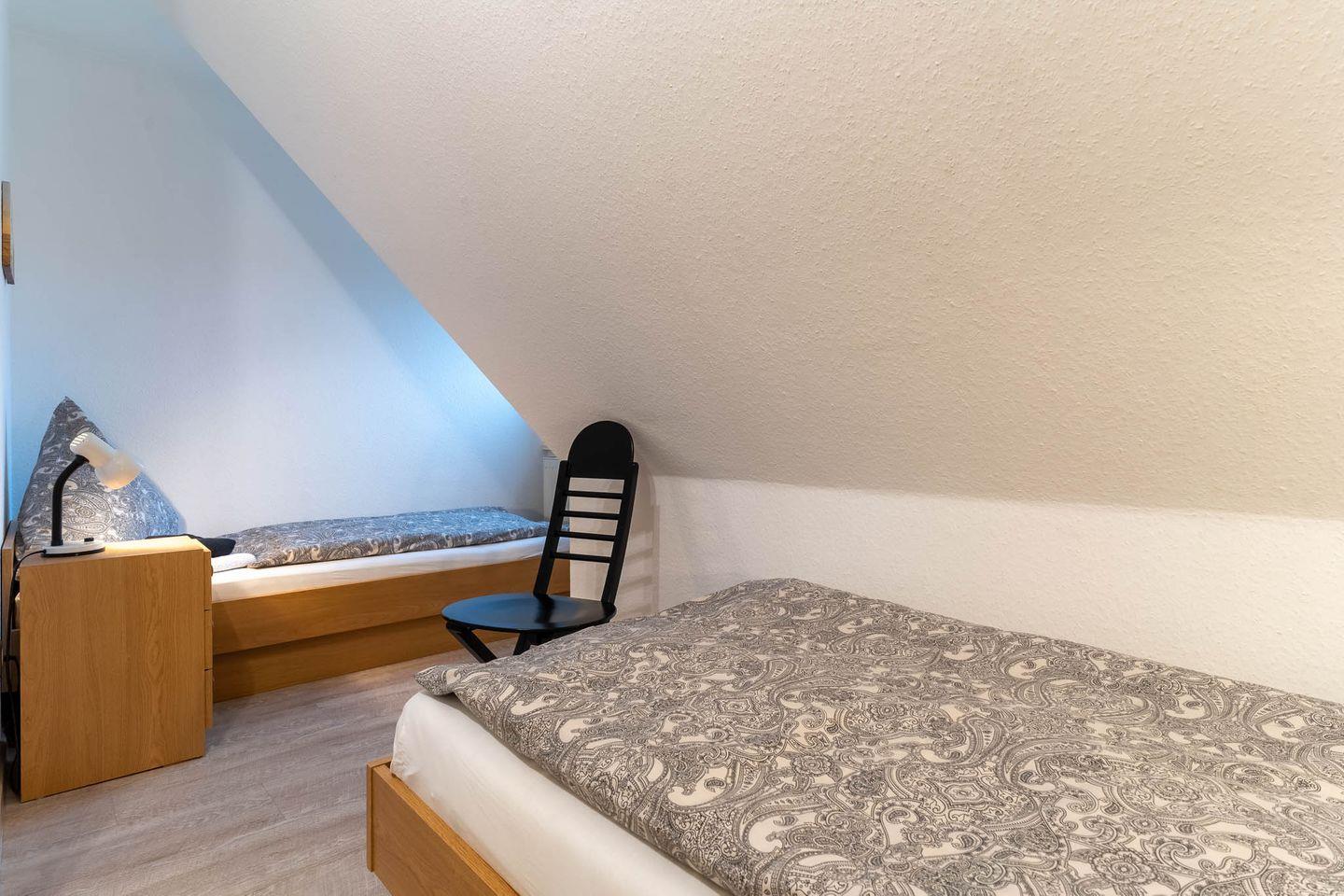 Die beiden Schlafzimmer im Obergeschoss laden zum Entspannen ein: Eines ist mit einem komfortablen Doppelbett ausgestattet, das andere mit zwei Einzelbetten – ideal für Familien oder Freunde.