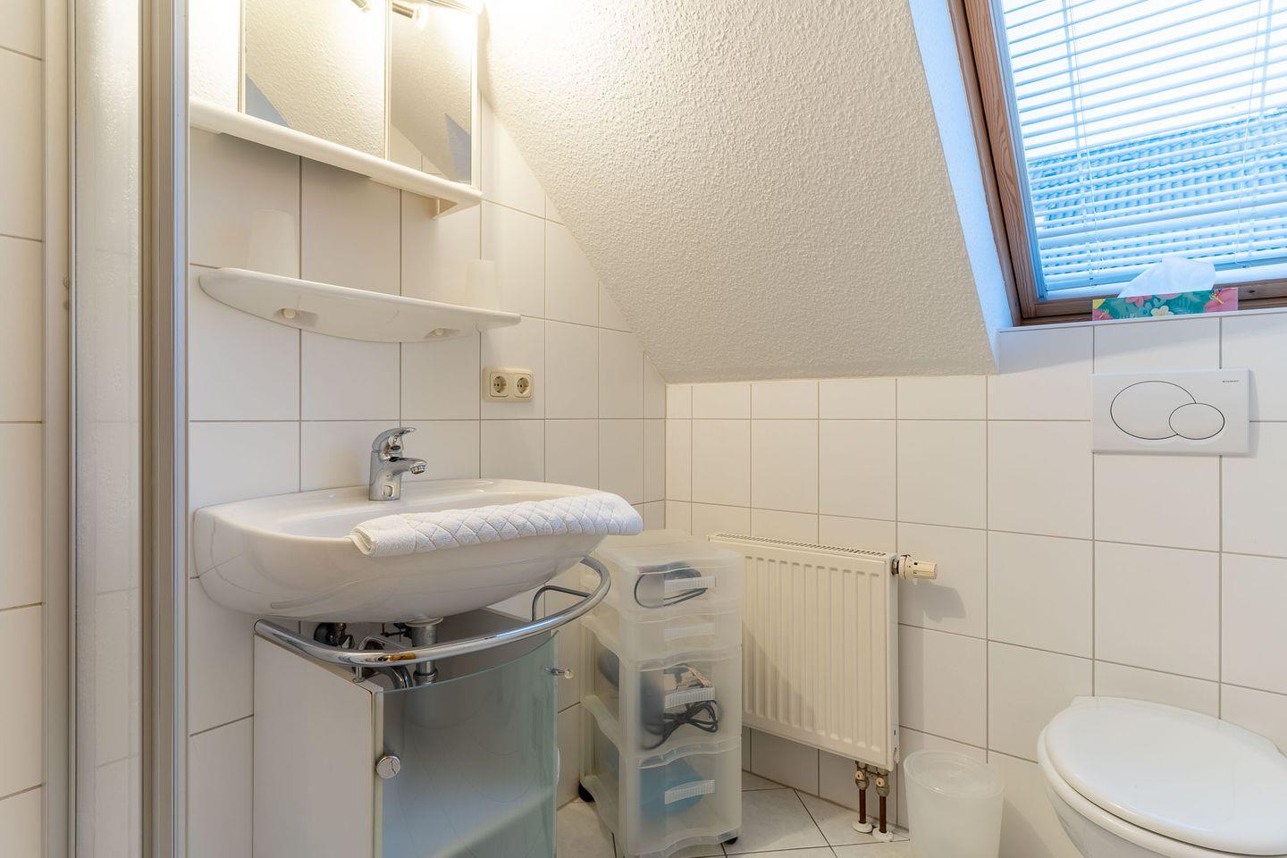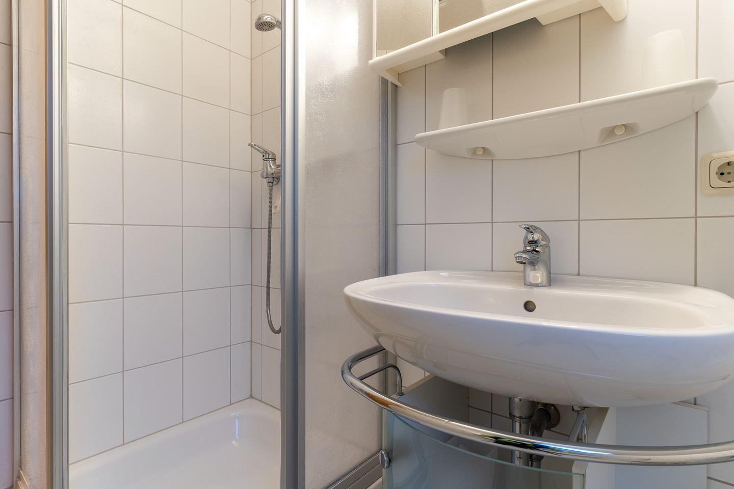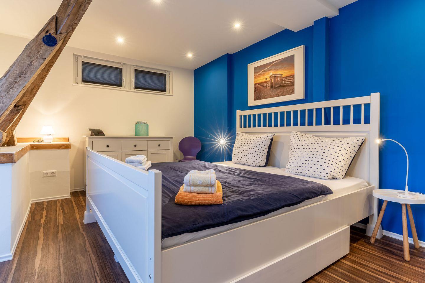 Das Schlafzimmer ist mit einem bequemen Doppelbett mit verstellbaren Lattenrosten ausgestattet, die jeweils die Maße 90 cm x 200 cm haben. Das kleine Badezimmer, gehalten in zurückhaltenden maritimen weißen Kacheln, bietet alles, was Sie für einen angenehmen Aufenthalt benötigen: Dusche, WC und Waschbecken.