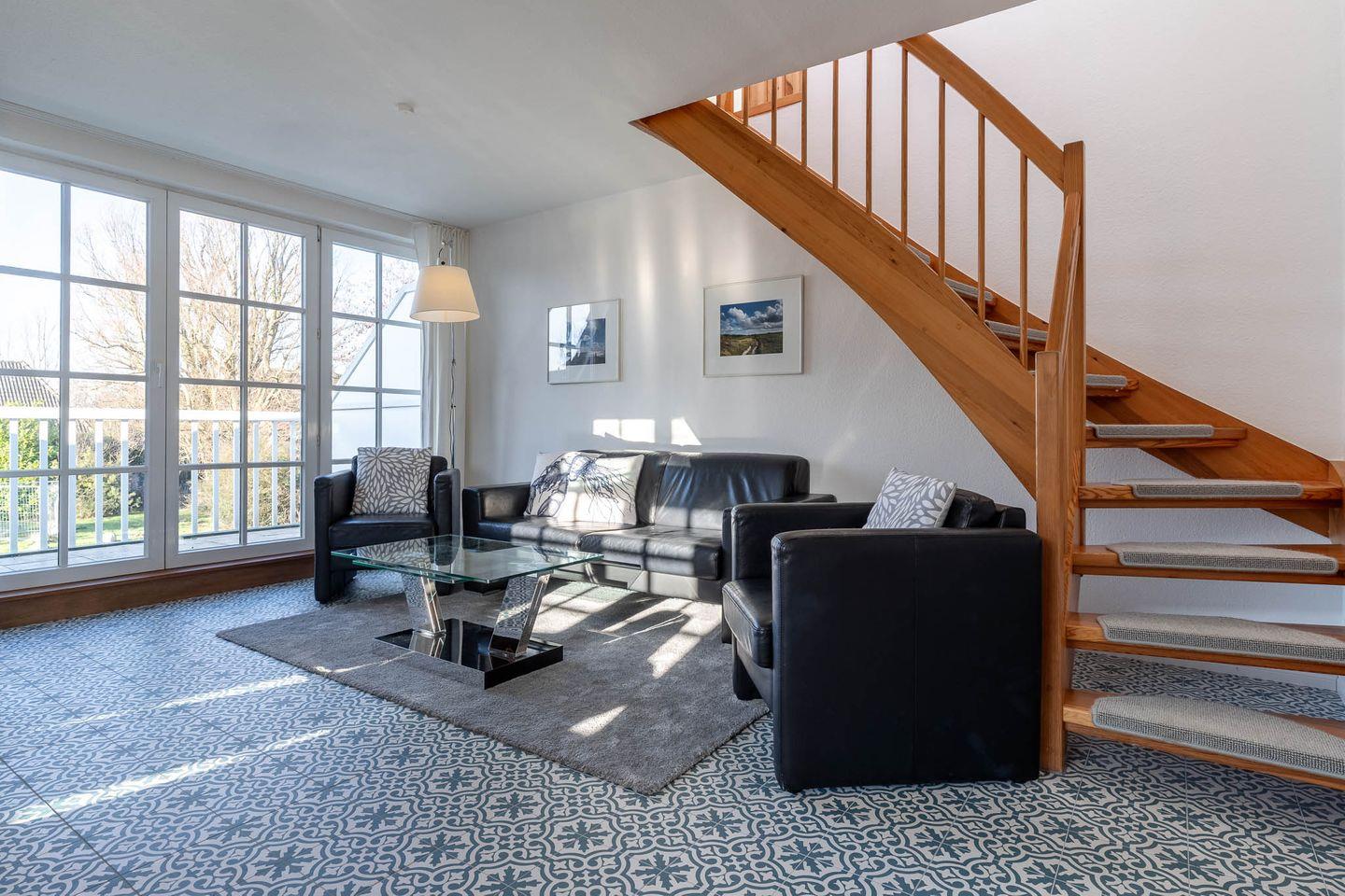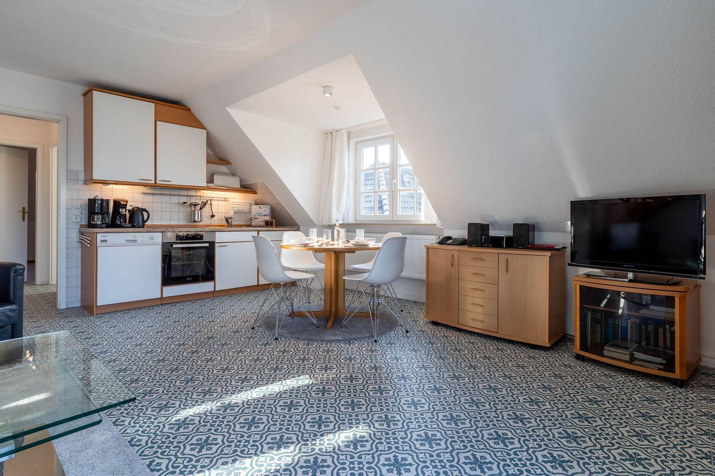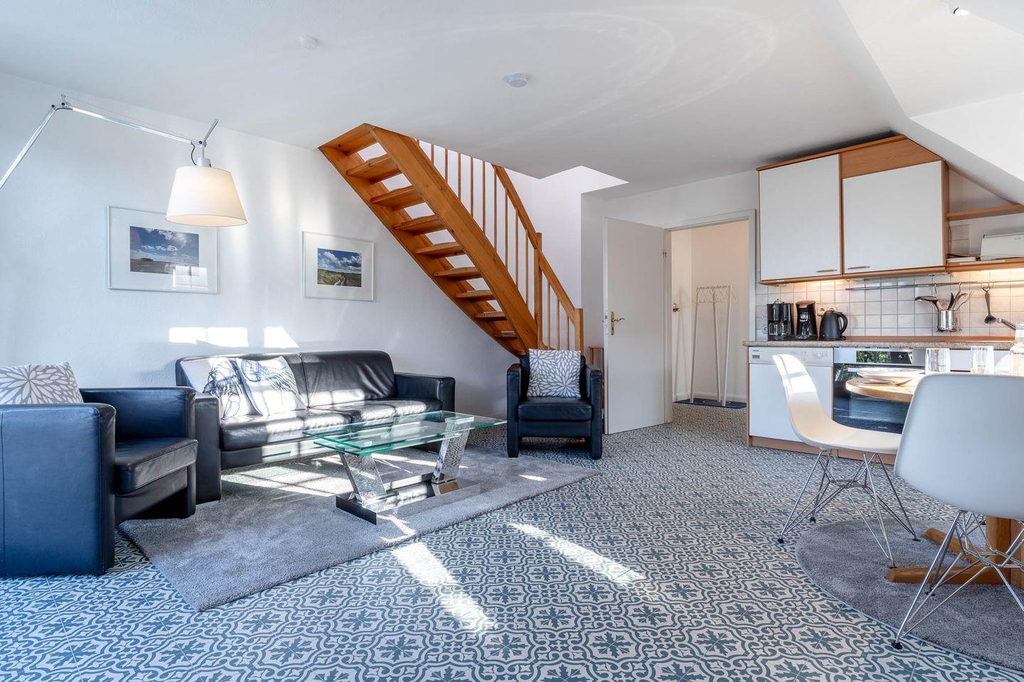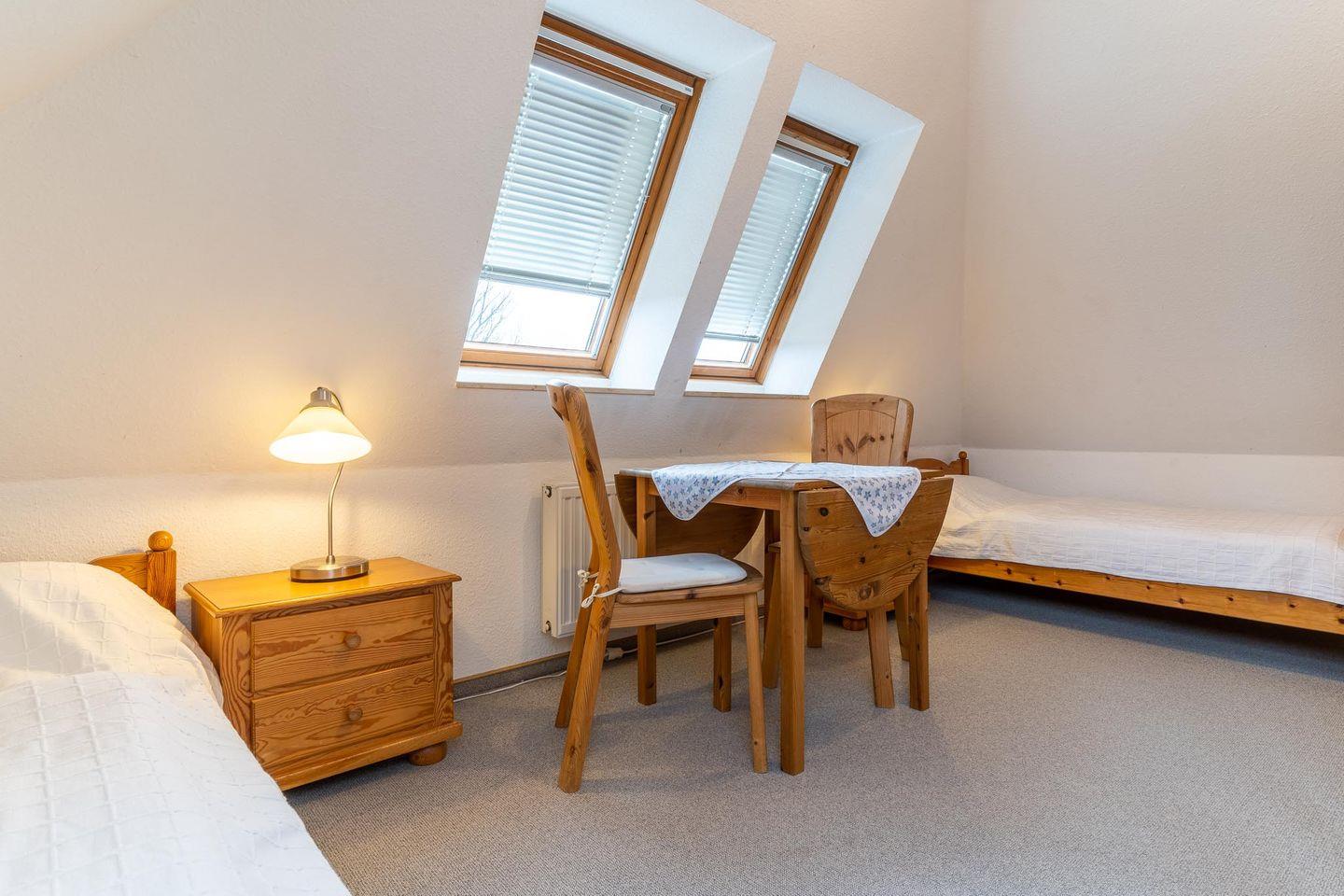 Die freundliche, über zwei Etagen angelegte Ferienwohnung, für 4 Personen, ist im Obergeschoss des Hauses gelegen. Sie ist ca. 68 m groß. Bei ihrer Ausstattung wurde besonderer Wert auf Behaglichkeit und Komfort gelegt. So befindet sich im Schlafraum ein Doppelbett (2 x 90 cm x 200 cm) mit Lattenrost. Im Wohnraum finden Sie Entspannung in der gemütlichen Sitzecke mit Flachbildschirm, Radio und Telefon.