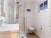 Das moderne Bad mit Fenster verfügt über eine bodentiefe Regendusche, Handtuchheizung, Waschbecken und WC.