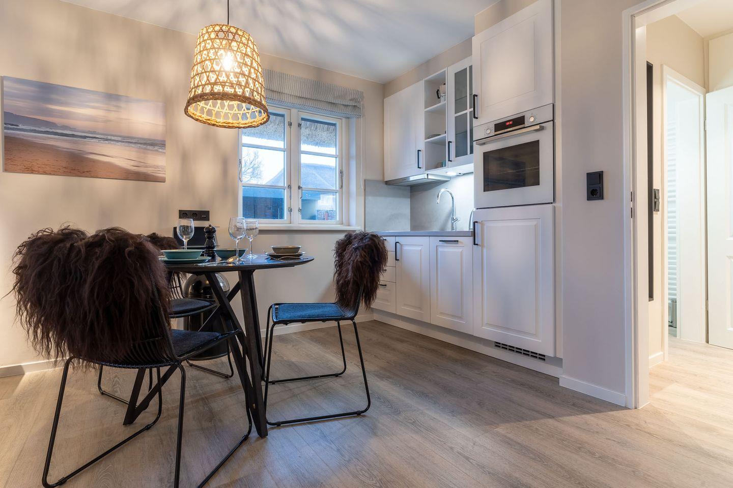 Am Esstisch oder auf der möblierten, eigenen Süd-WestTerrasse unter Reet lässt es sich mit frischen Brötchen vom nahegelegenen Bäcker wunderbar in den Urlaubstag starten.