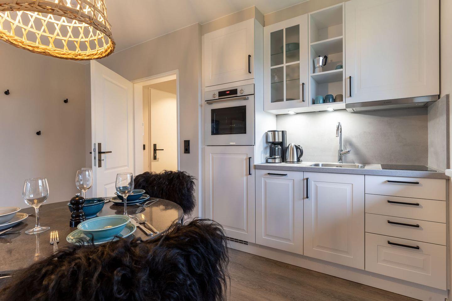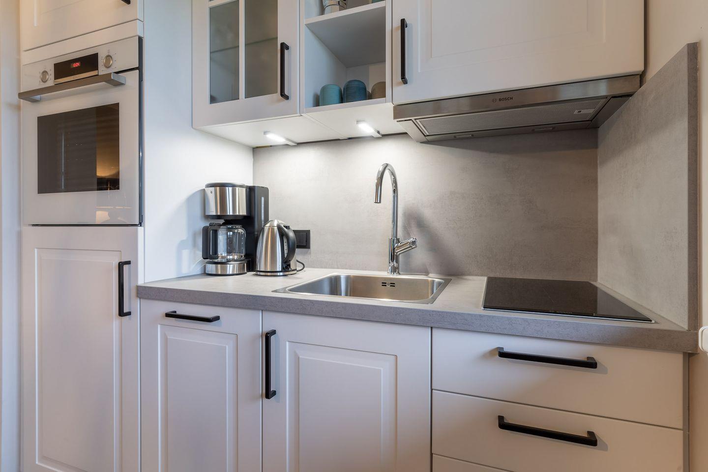 Eine Kochnische mit einer umfangreich ausgestatteten Pantryküche fügt sich passend ein und hat mit einem 2-Felder-Ceranfeld, Spülmaschine, Espressokocher, Kühlschrank samt Gefriermöglichkeit usw. so einiges zu bieten.