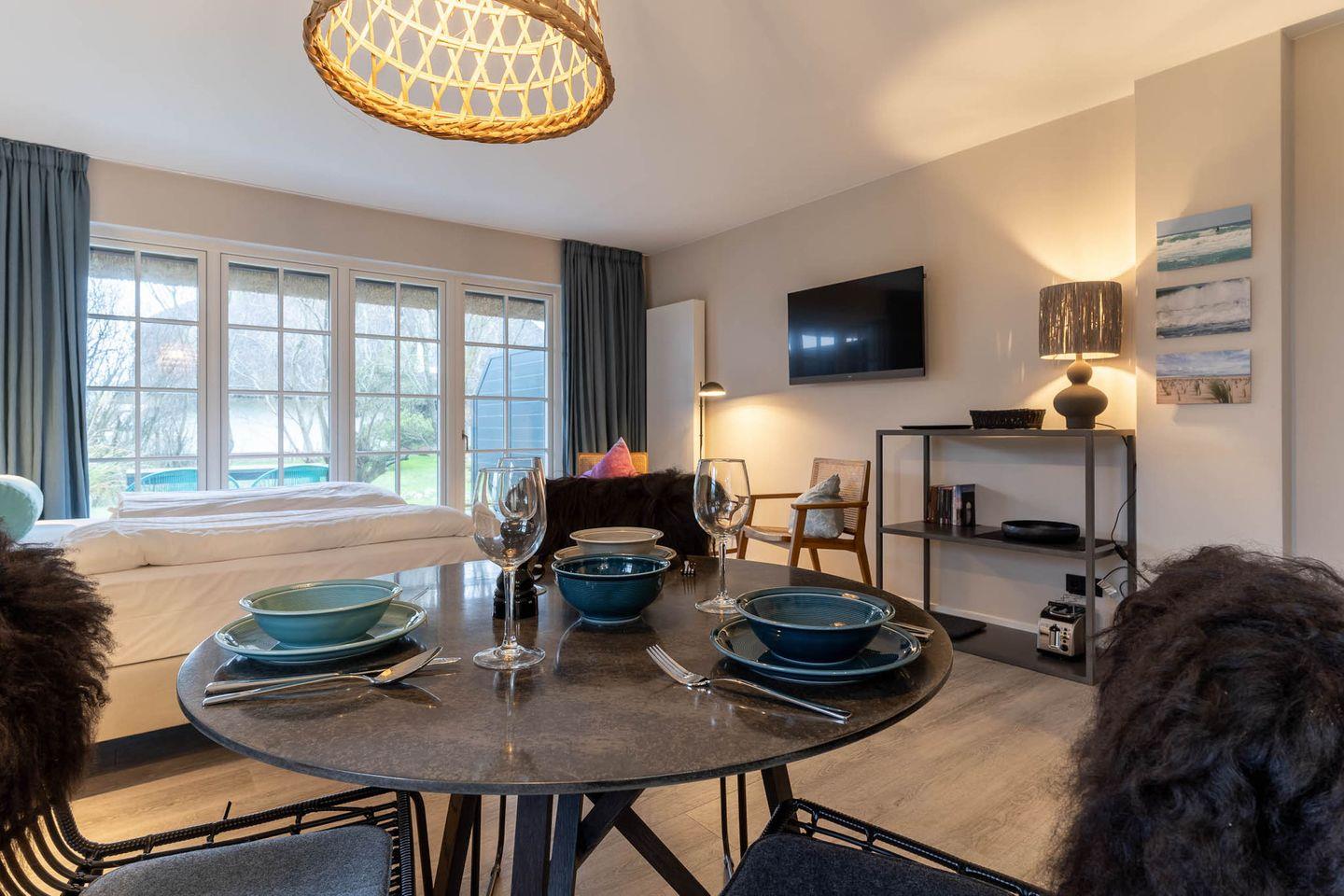 Das wunderschöne, lichtdurchflutete Appartement "Beach Lodge 6" in dem 2022 komplett renovierten "Reethaus Beach Lodge" verfügt über ca. 30 m² Wohnfläche und einer gemütlichen Terrasse.