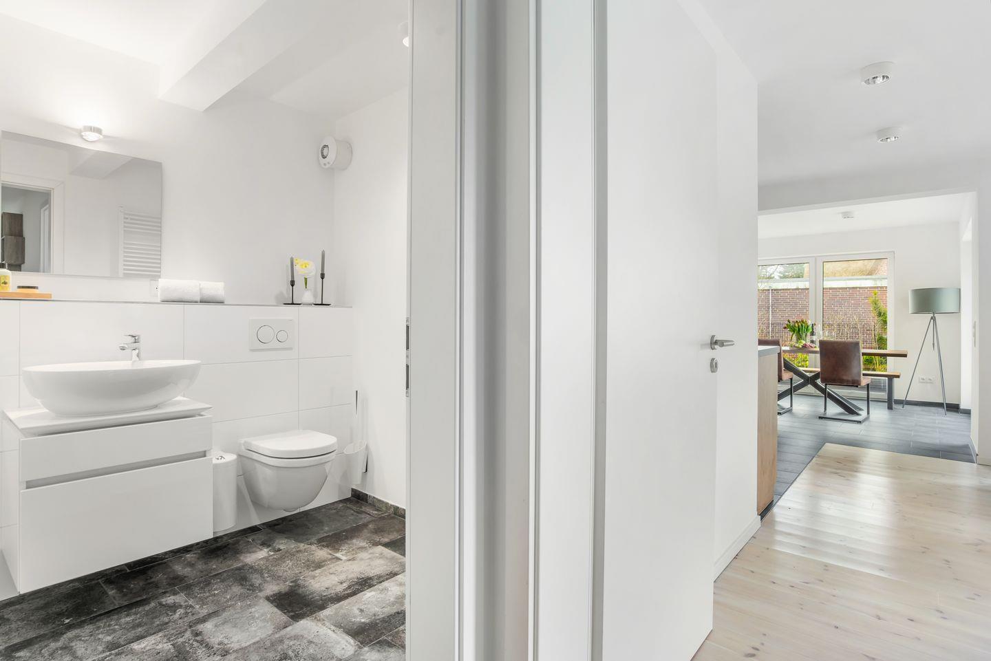 Die Küche ist umfassend ausgestattet: Ceran-Herd, Backofen, Mikrowelle, Kühlschrank mit Gefrierfach, Spülmaschine sowie alle notwendigen Küchenutensilien, Geschirr und Besteck. Für den Start in den Urlaub ist eine Erstausstattung vorhanden. Kaffeemaschine, Wasserkocher und Toaster runden die Ausstattung ab. Im Bad findest du eine bodengleiche Dusche, warmes Wasser, WC, Waschbecken, Spiegel, Kosmetikspiegel und Haartrockner. Ein Bügeleisen und Bügelbrett sind ebenfalls vorhanden. Die Waschmaschine kann gemeinschaftlich genutzt werden; zusätzlich stehen Wäscheständer und Staubsauger bereit.