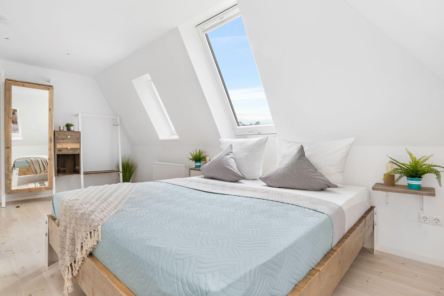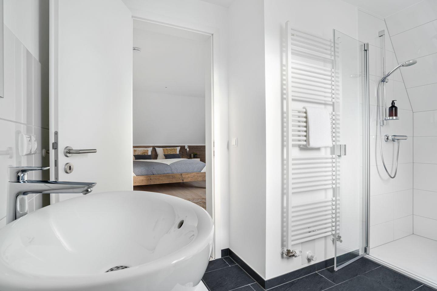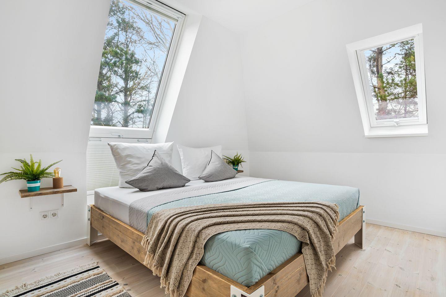 Neben 2 Schlafzimmern mit Doppelbetten bietet die Wohnung eine vollausgestattete offene Küche mit angrenzendem Essbereich, sowie 2 Duschbäder. Die gemeinschaftliche Sauna mit Ruheraum im OG lädt zum Relaxen ein. Im Obergeschoss steht eine gemeinschaftliche Waschmaschine mit Wäschetrockner zur Verfügung. Highlight der Wohnung ist die geräumige, möblierte Dachterrasse. Ihren PKW können Sie direkt am Haus parken. Mitgebrachte Fahrräder können vor dem Haus in einem Fahrradständer abgestellt werden.