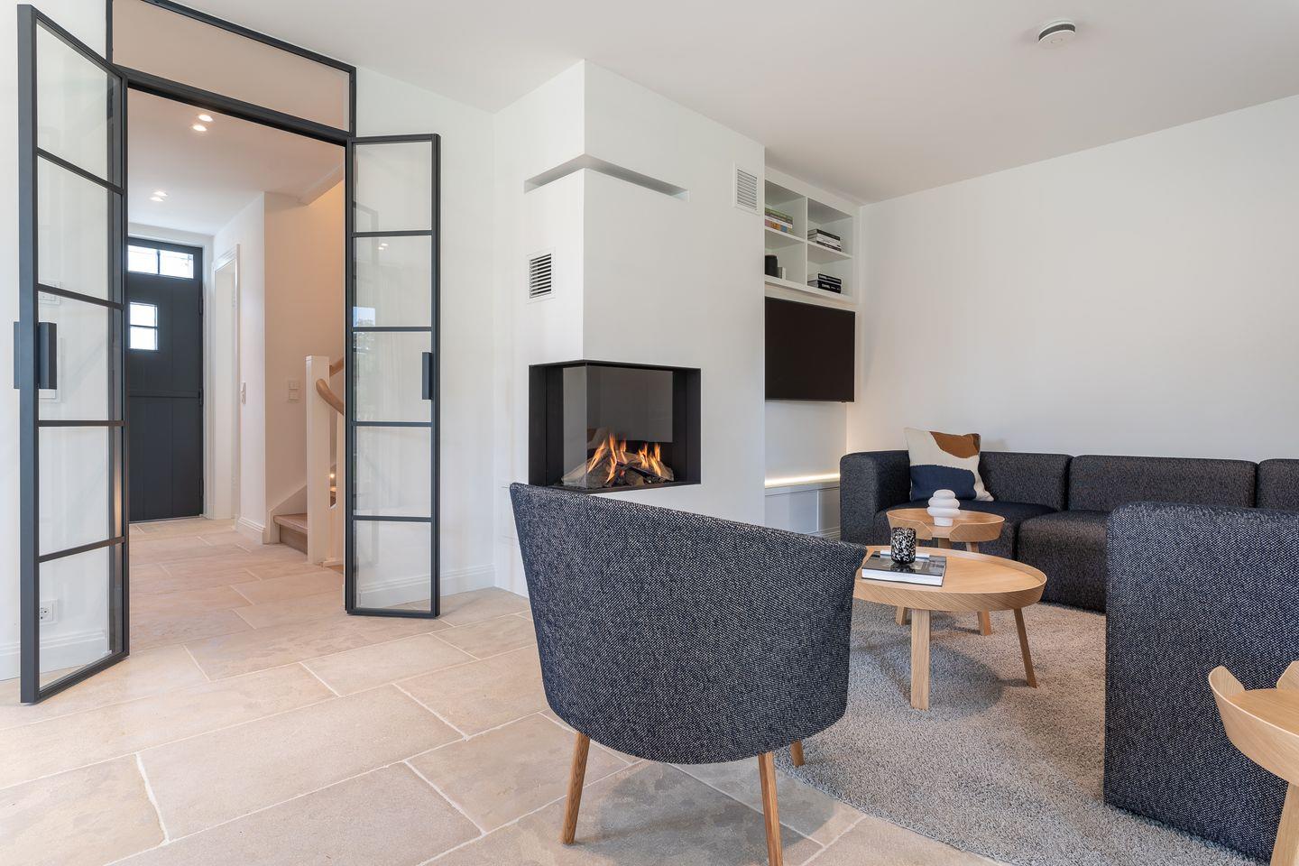 Im Erdgeschoss erwartet Sie ein lichtdurchflutetes Wohnzimmer mit Gaskamin und TV, eine offene Küche sowie ein gemütliches Esszimmer. Die Küche verfügt über hochwertige Elektrogeräte und genügend Platz zum gemeinsamen Kochen. An den Wohnbereich schließt sich ein Flur sowie ein Gäste-WC an.