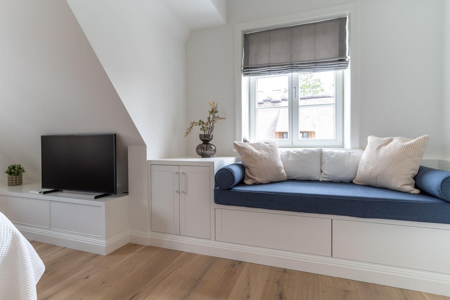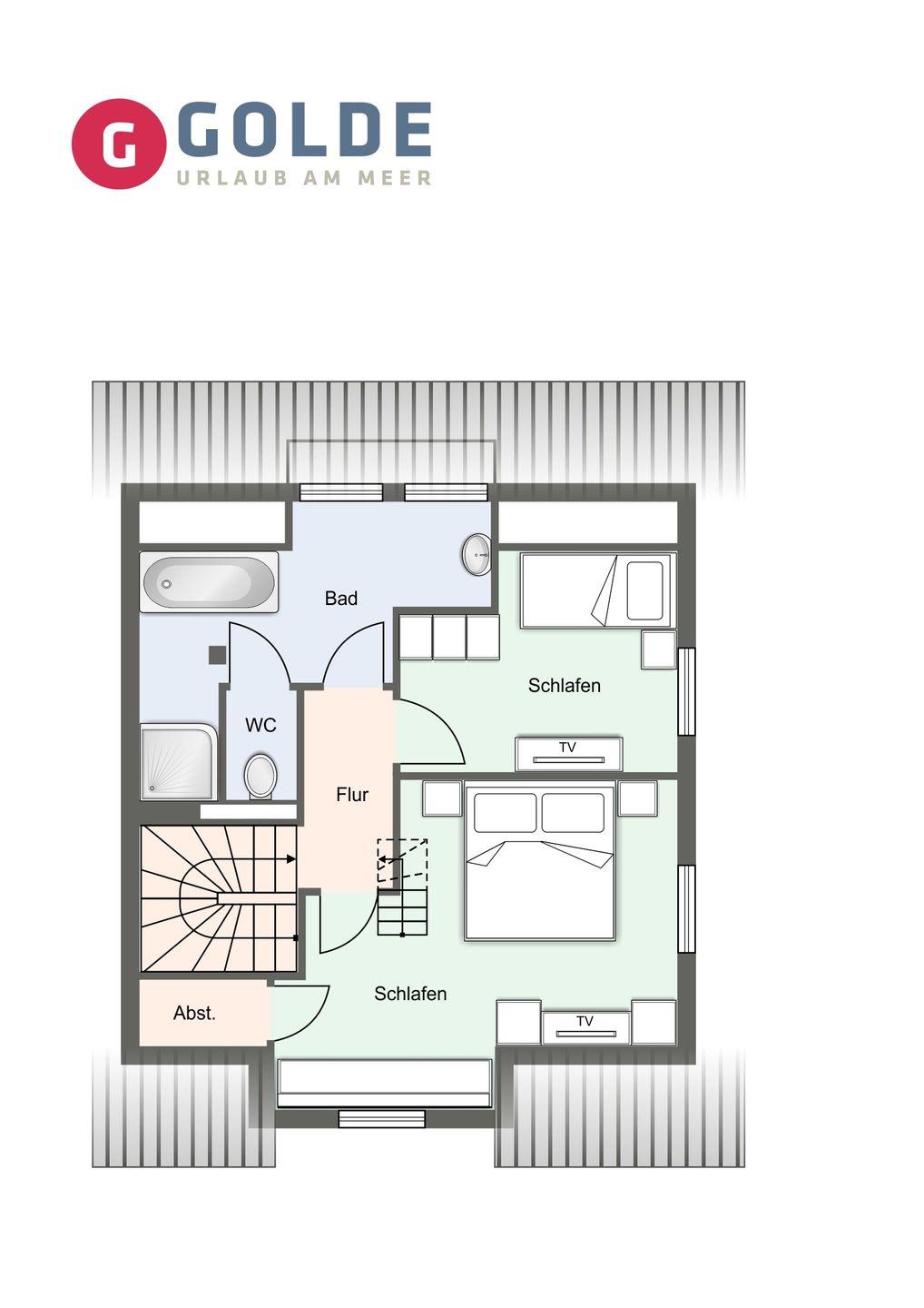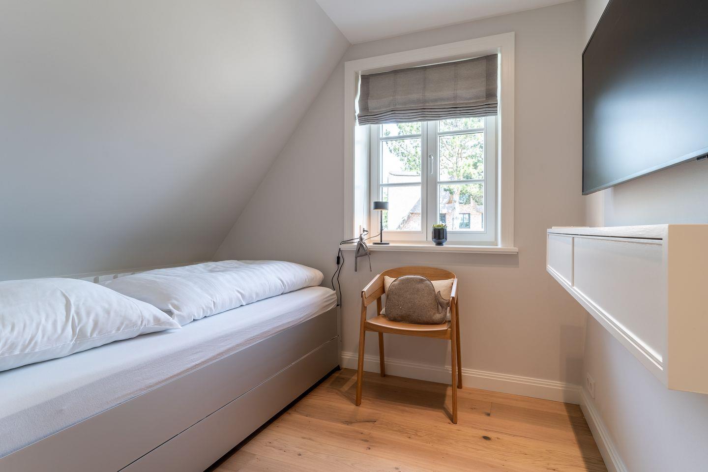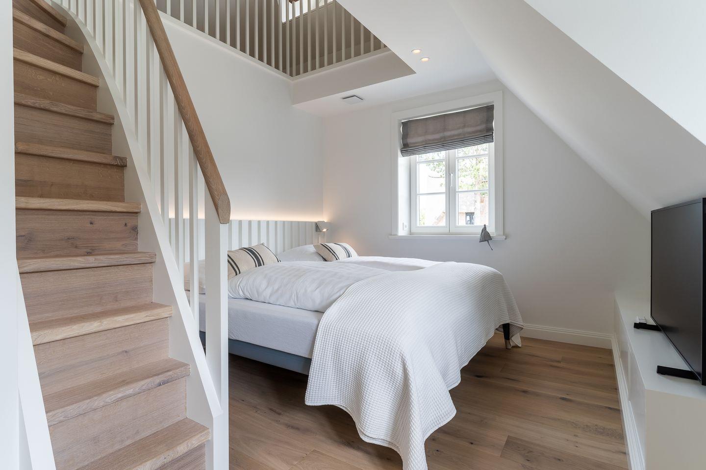 Über eine Holztreppe gelangt man in das Obergeschoss. Die zwei Schlafzimmer, eines mit einem Doppelbett und eines mit einem Einzelbett sind mit einem TV ausgestattet. Kleiderschränke gewähren Ihnen viel Stauraum.