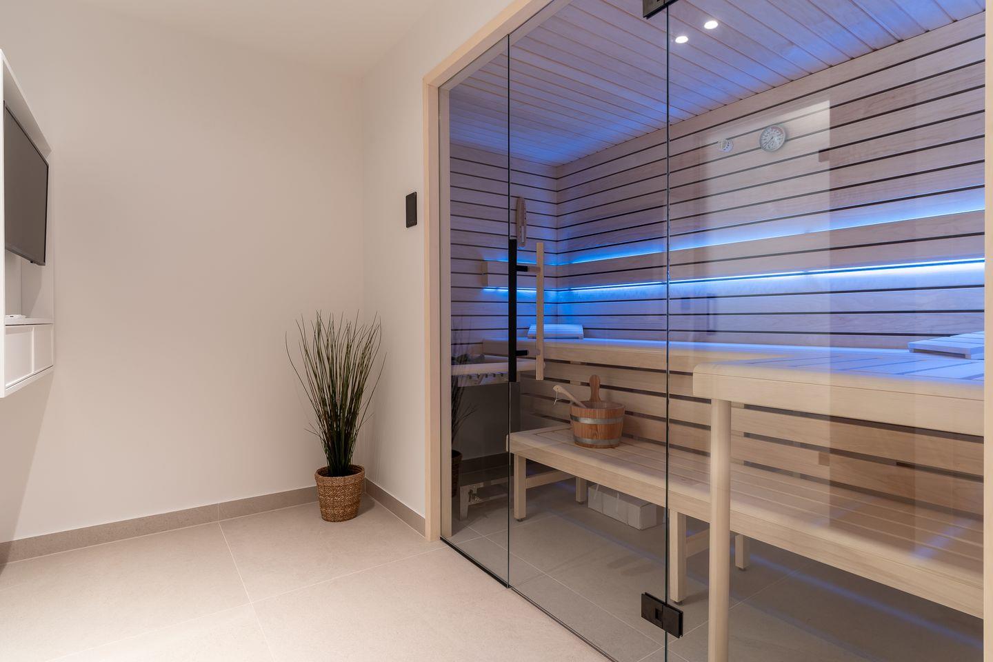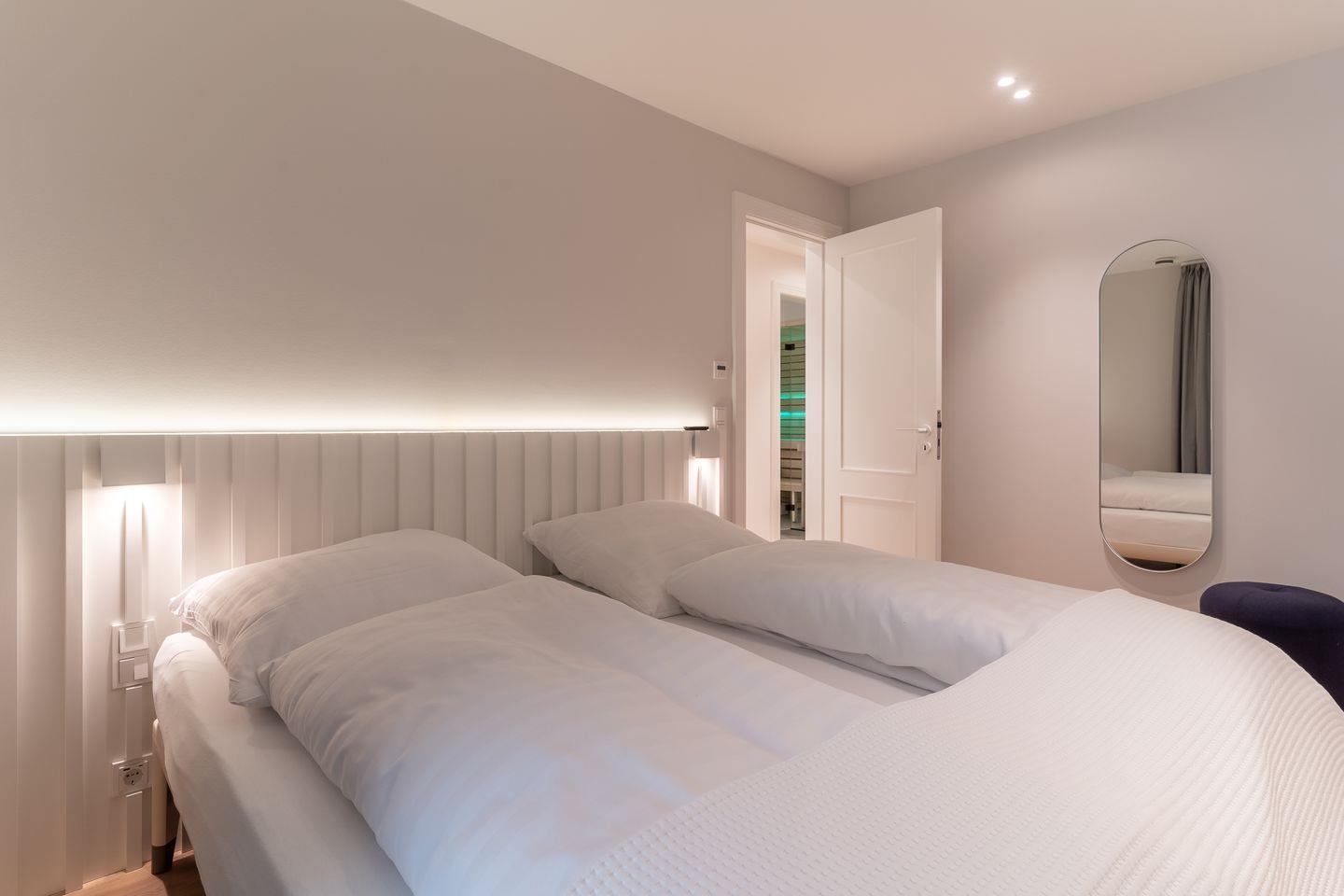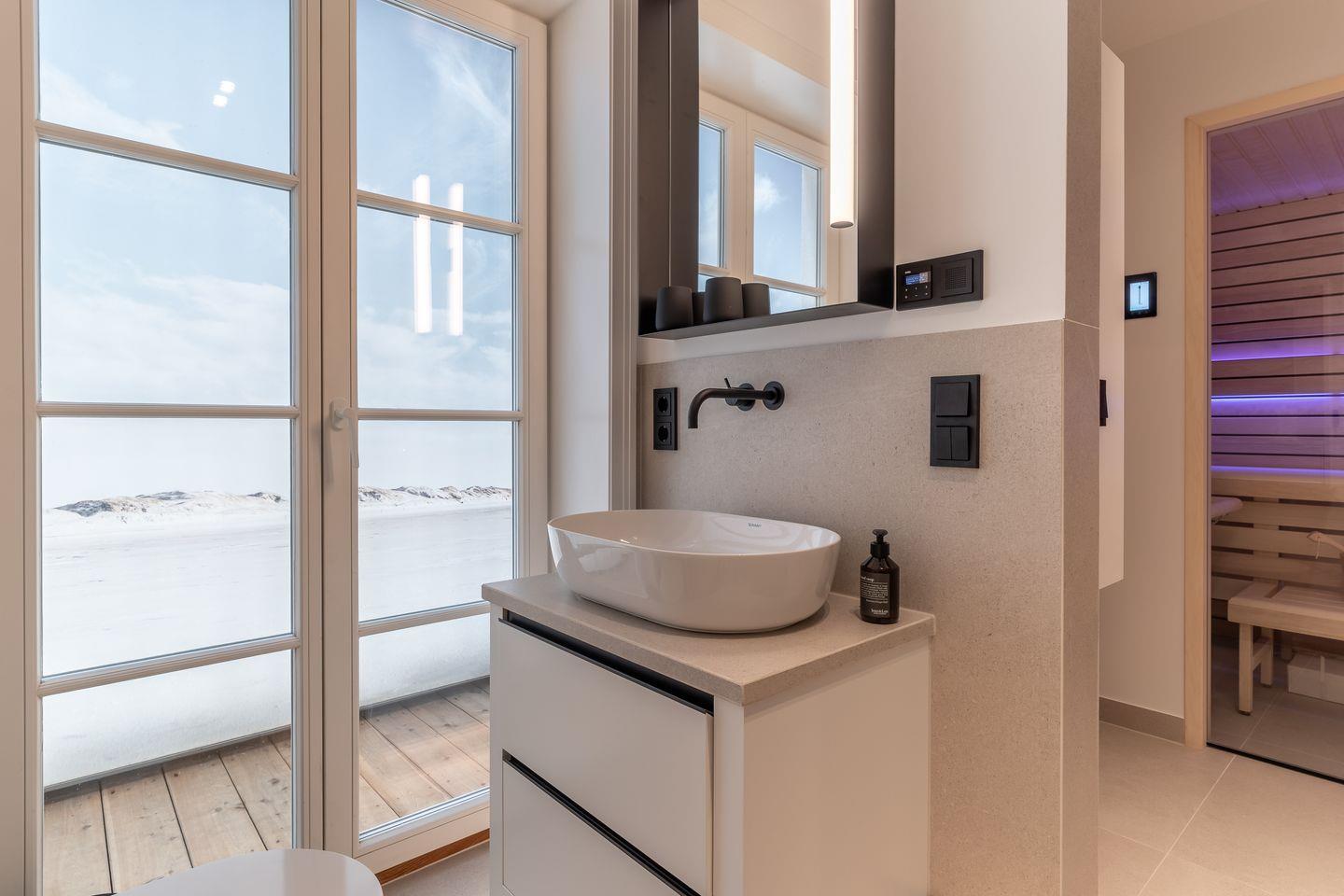 Das volle Wohlfühlprogramm erwartet Sie im Untergeschoss, das sowohl durch natürliches Tageslicht, als auch durch eine Strandbilder-Beleuchtung illuminiert wird. Sie gelangen direkt in den großzügigen Entspannungsbereich mit Sauna, großer Dusche und TV.