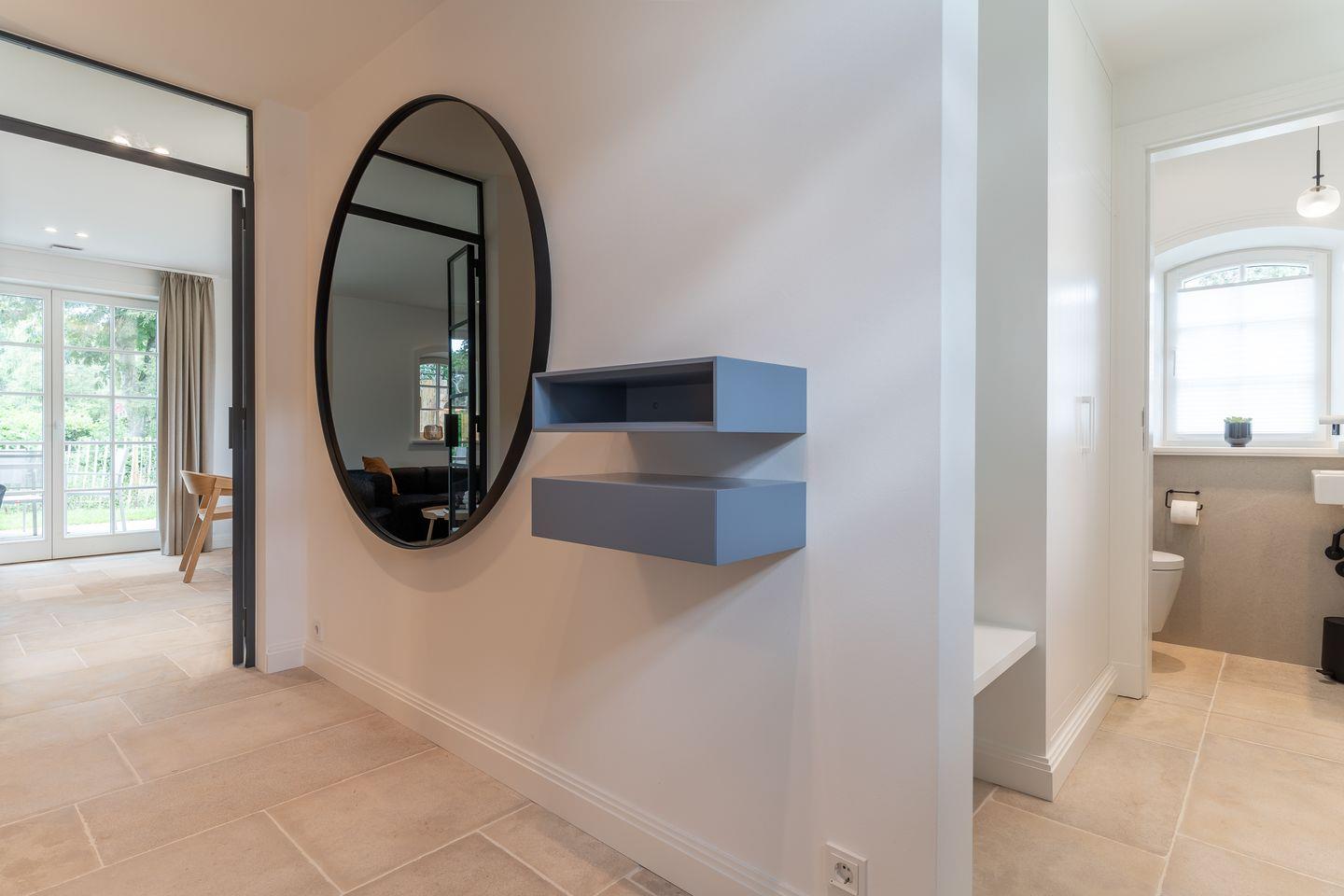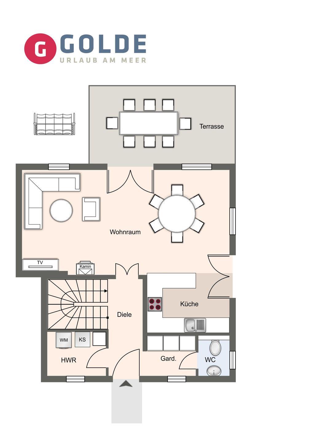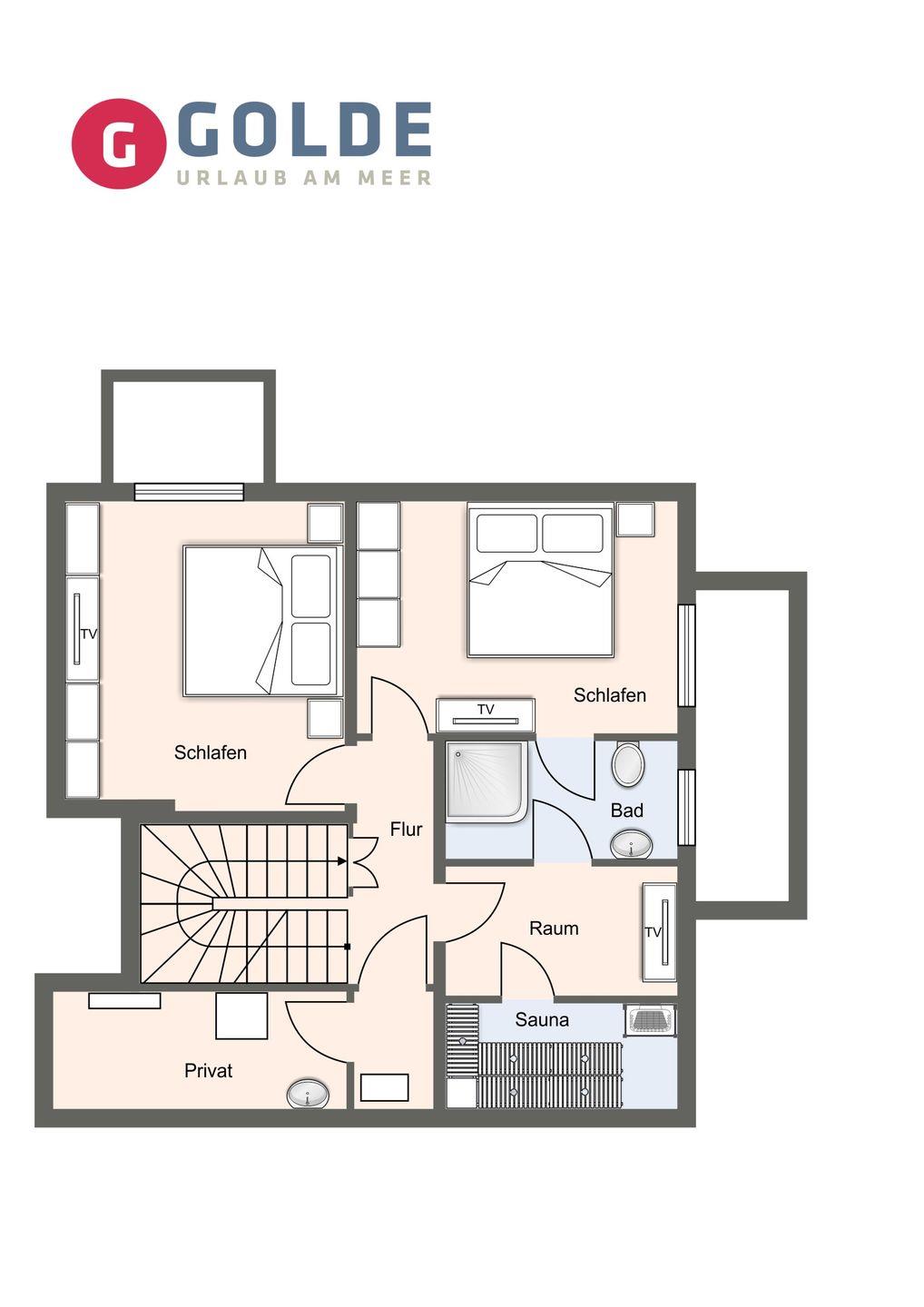 Das volle Wohlfühlprogramm erwartet Sie im Untergeschoss, das sowohl durch natürliches Tageslicht, als auch durch eine Strandbilder-Beleuchtung illuminiert wird. Sie gelangen direkt in den großzügigen Entspannungsbereich mit Sauna, großer Dusche und TV.