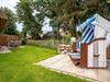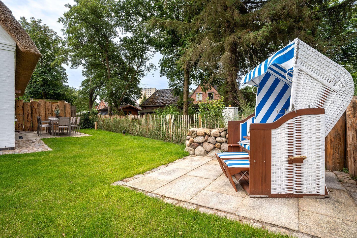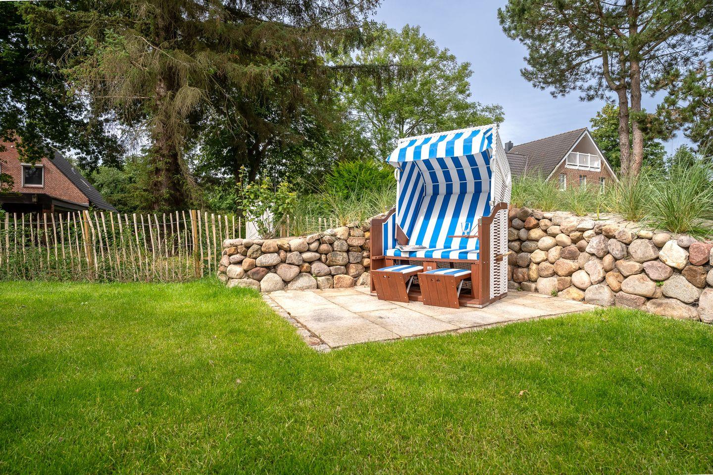 Das Grundstück mit Stellplatz, Rasenfläche rund um das Haus und zwei sonnigen Süd- und West-Terrassen ist mit heimischen Pflanzen angelegt. Ein Strandkorb lädt zu gemütlichen Stunden im Freien ein.