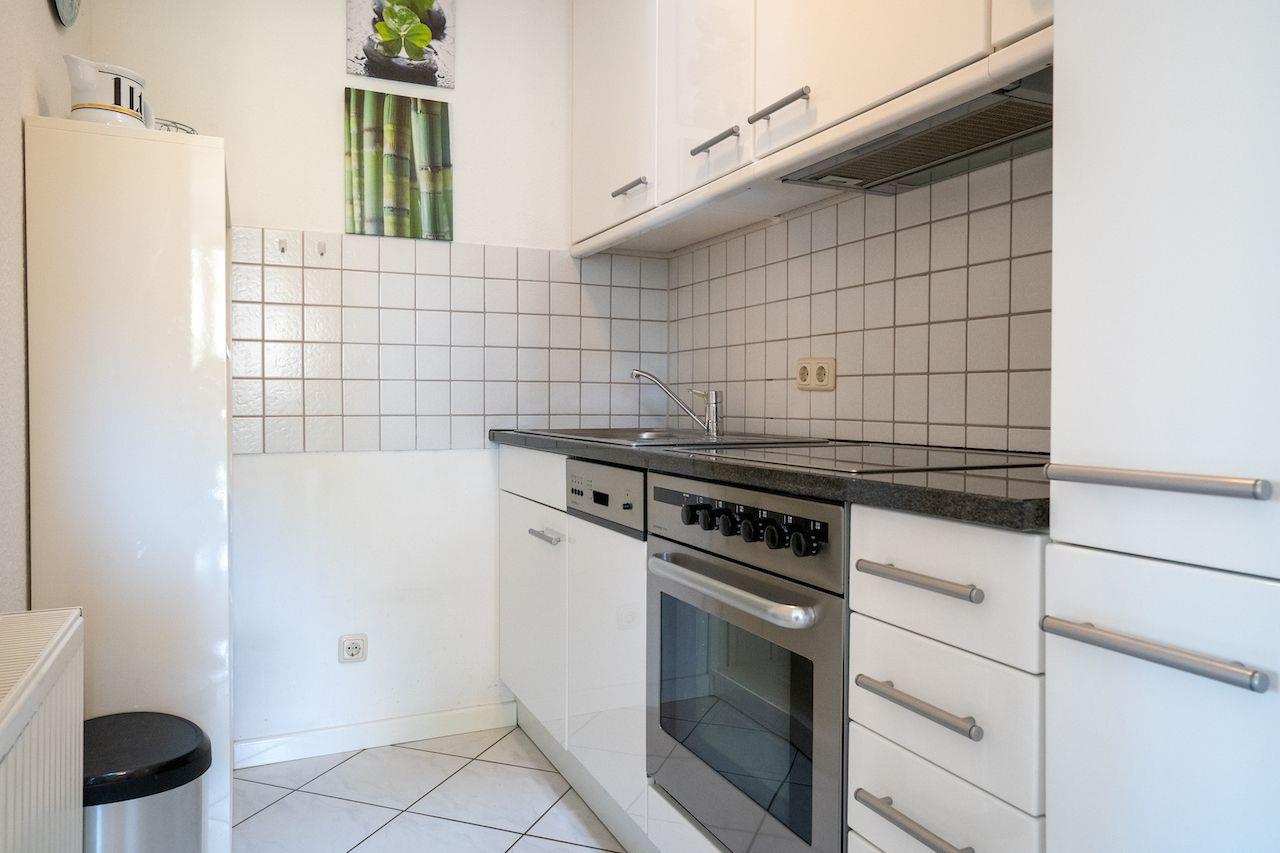 Küche mit Cerankochfeld, Geschirrspüler, Backofen, Gefrierschrank, Granitarbeitsplatte