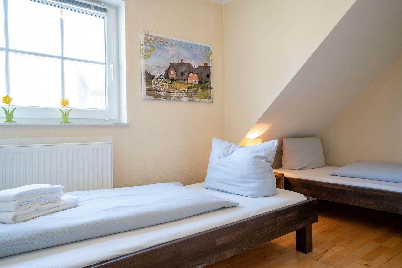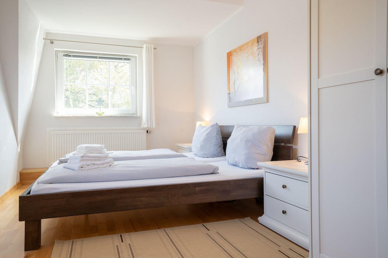 Schlafzimmer mit Parkettfußboden, 2 Einzelbetten, Kleiderschrank