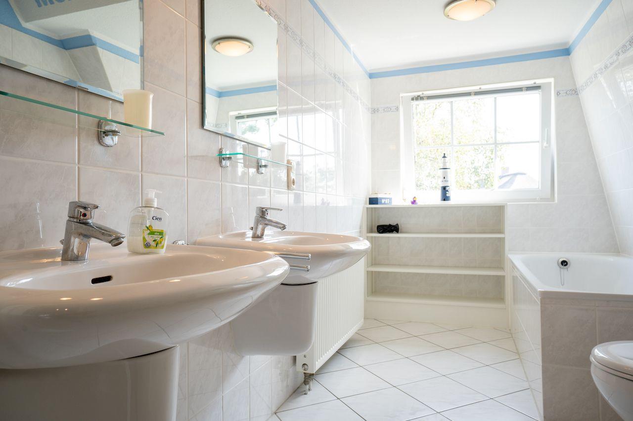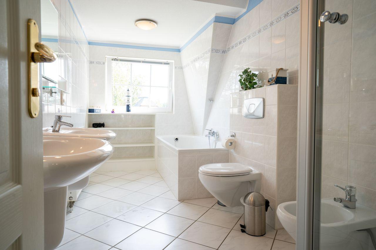 großes Wohlfühl-Badezimmer mit 2 Waschbecken, WC, Bidet, Badewanne und Dusche, Föhn