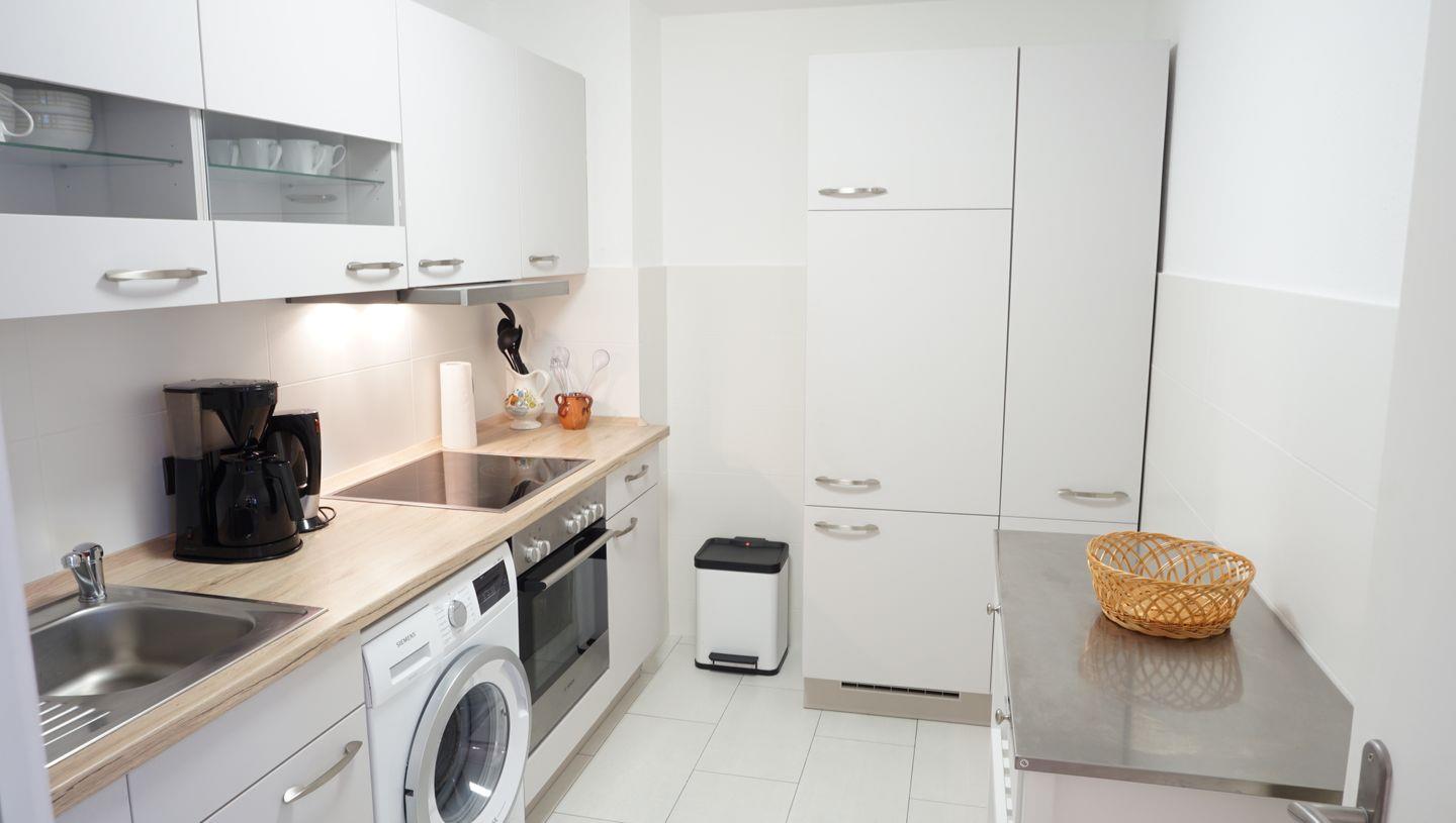 Einbauküche mit Geschirrspülmaschine und Waschmaschine, Küchenrollwagen