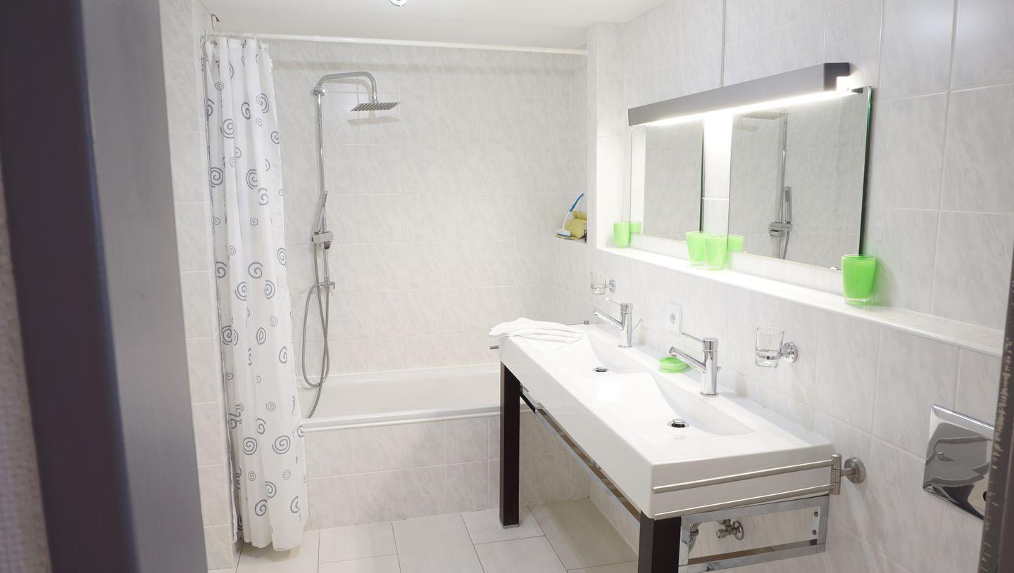 Badezimmer mit Doppelwaschbecken, Badewanne mit Duschabtrennung und WC