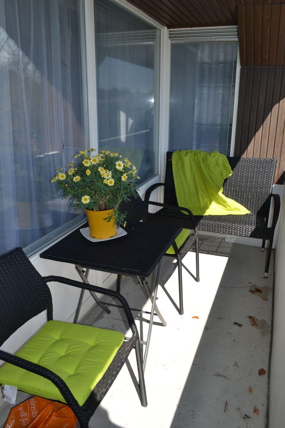 Balkon mit kleiner Bank und Sitzmöbeln (an der Giebelseite des Appartementhauses)