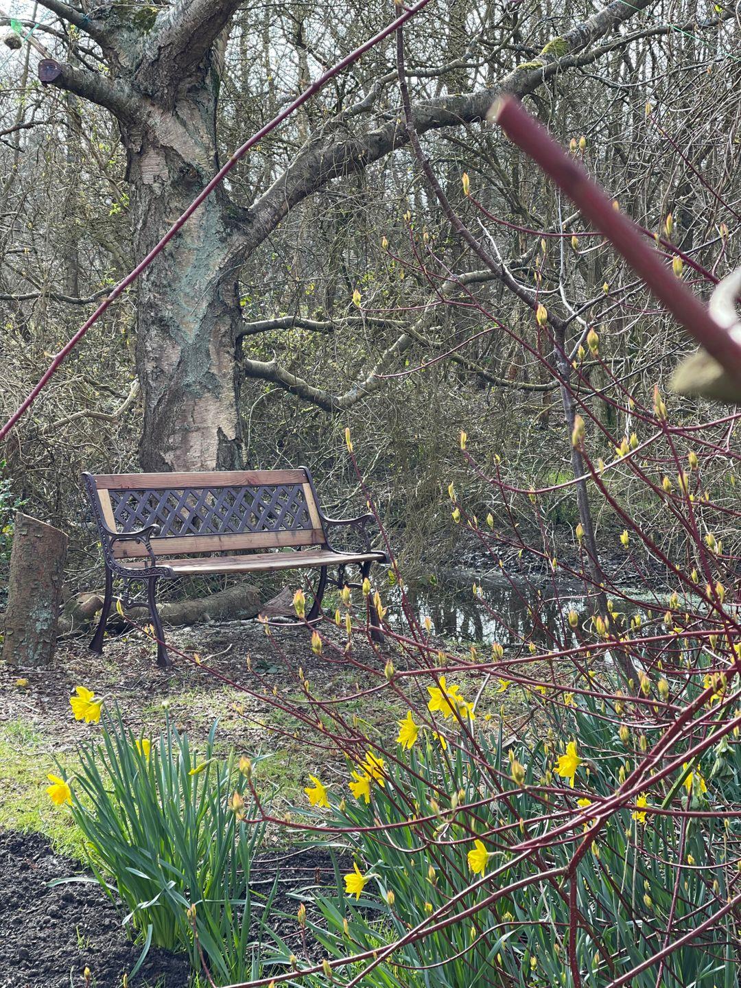 Garten mit Gartenmöbeln und Sitzmöglichkeit am Bach