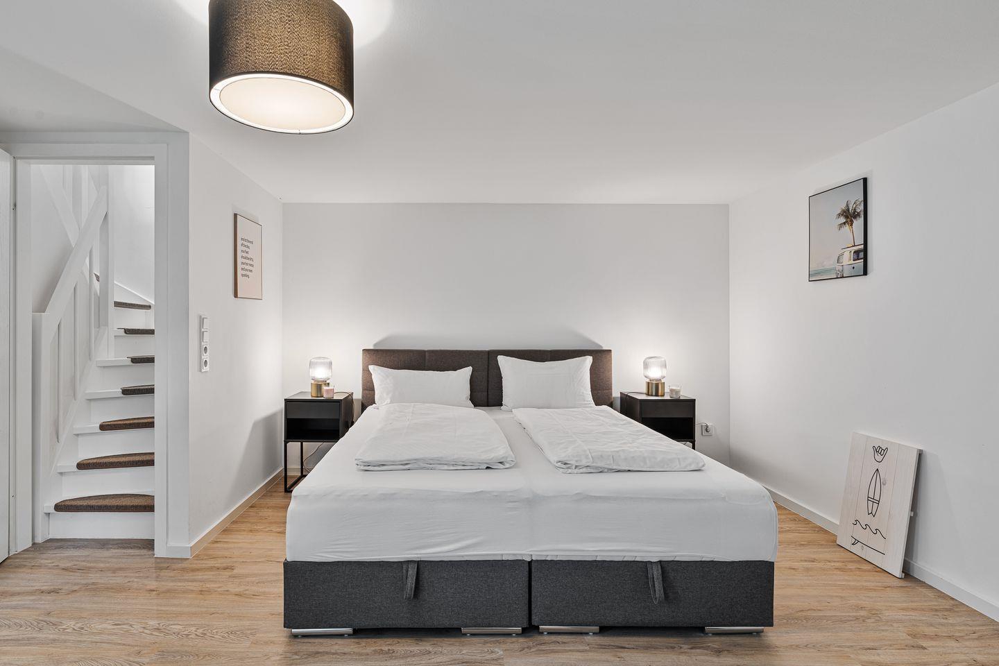 Das erste Schlafzimmer von zwei verfügt über ein komfortables Doppelbett (180x200cm) mit Kleiderschrank. Das elegante Badezimmer beeindruckt mit einer modernen bodengleichen Regen-Dusche, WC und einem Föhn für Ihren Komfort.