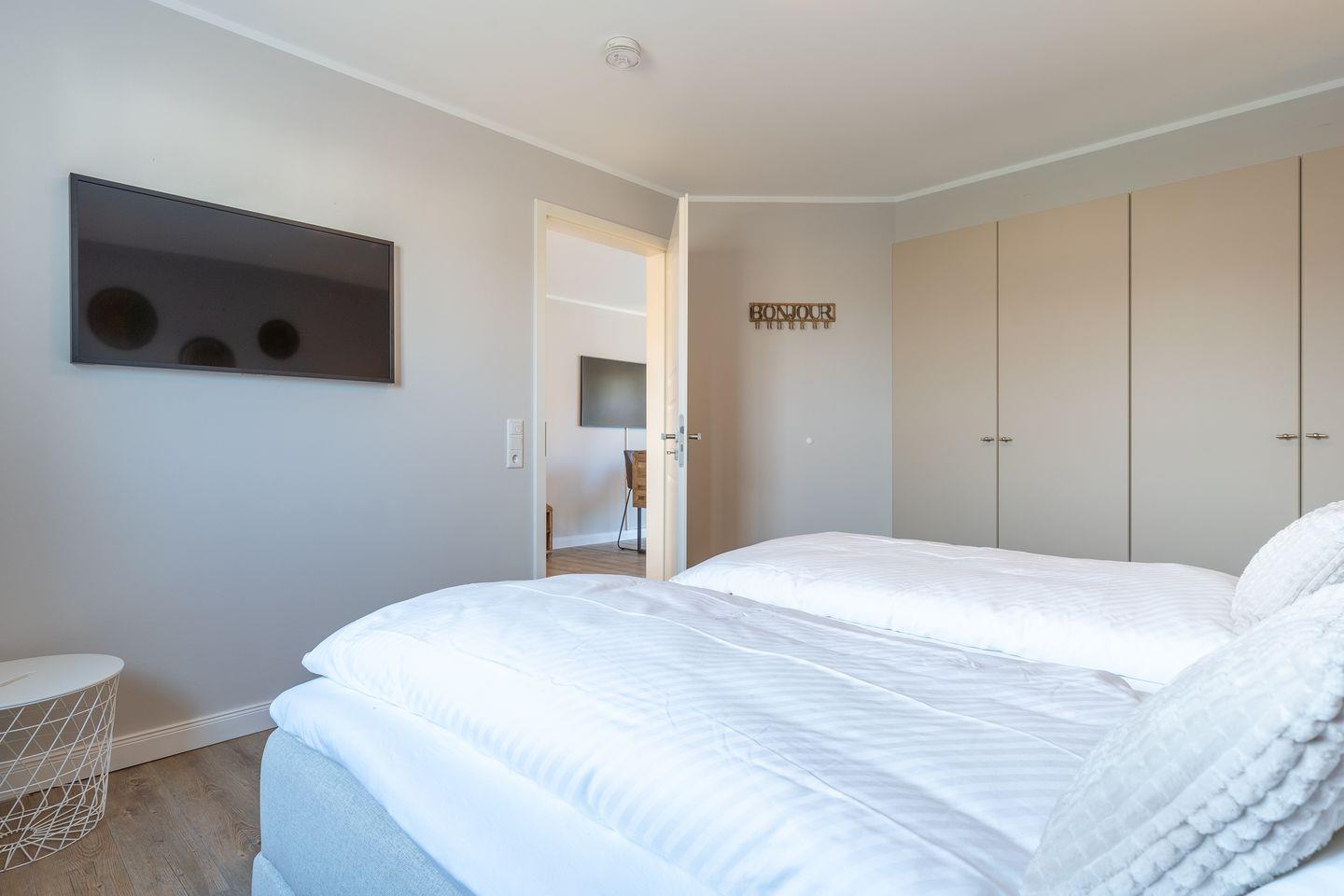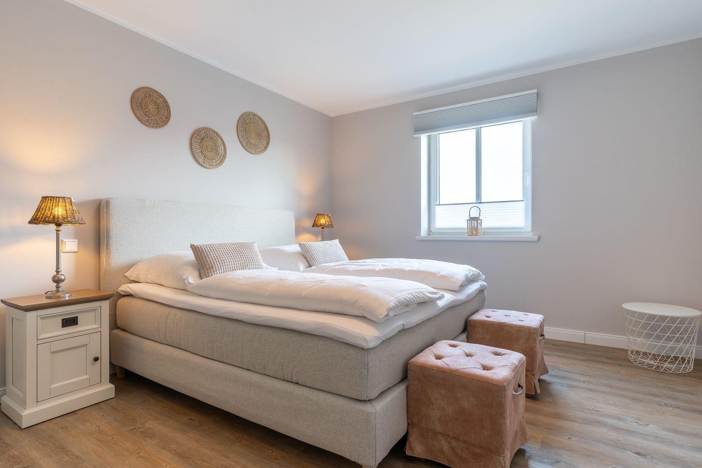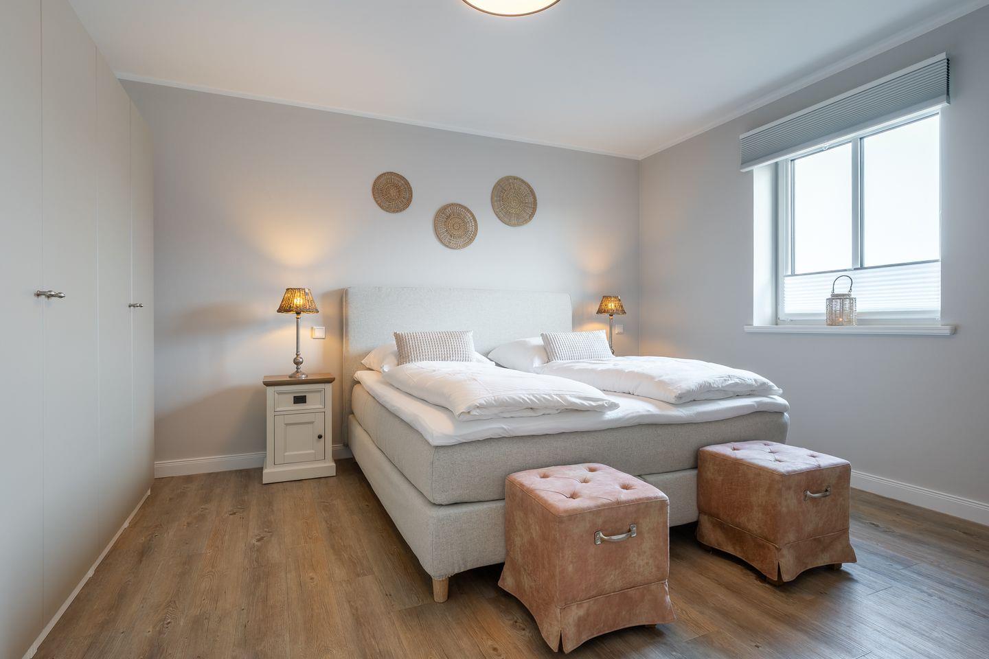 Das großzügig geschnittene Schlafzimmer mit ausreichend Stauraum verspricht erholsame Nächte. Zusätzlich gibt es im Wohnzimmer ein gemütliches Schlafsofa für eine Personen.