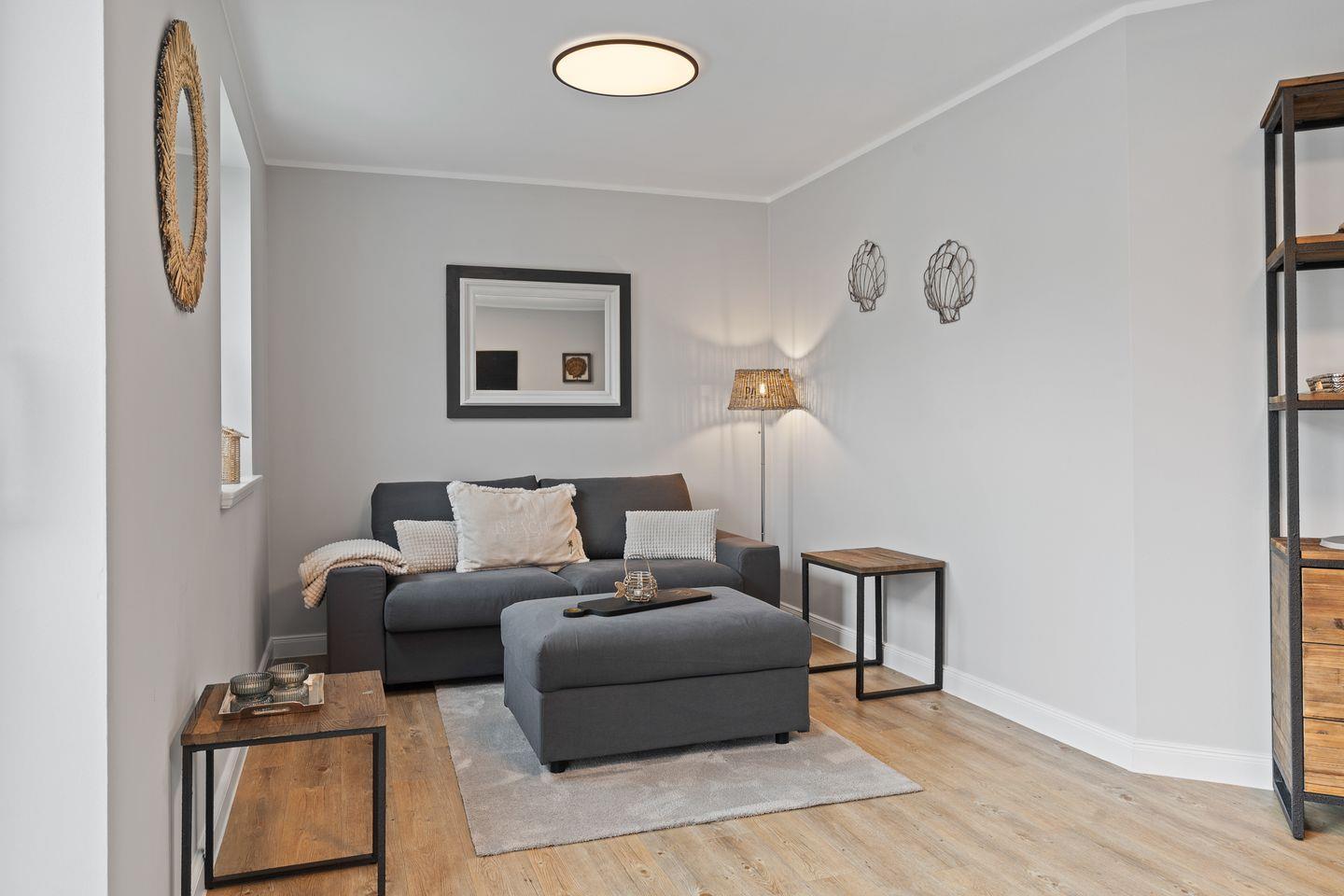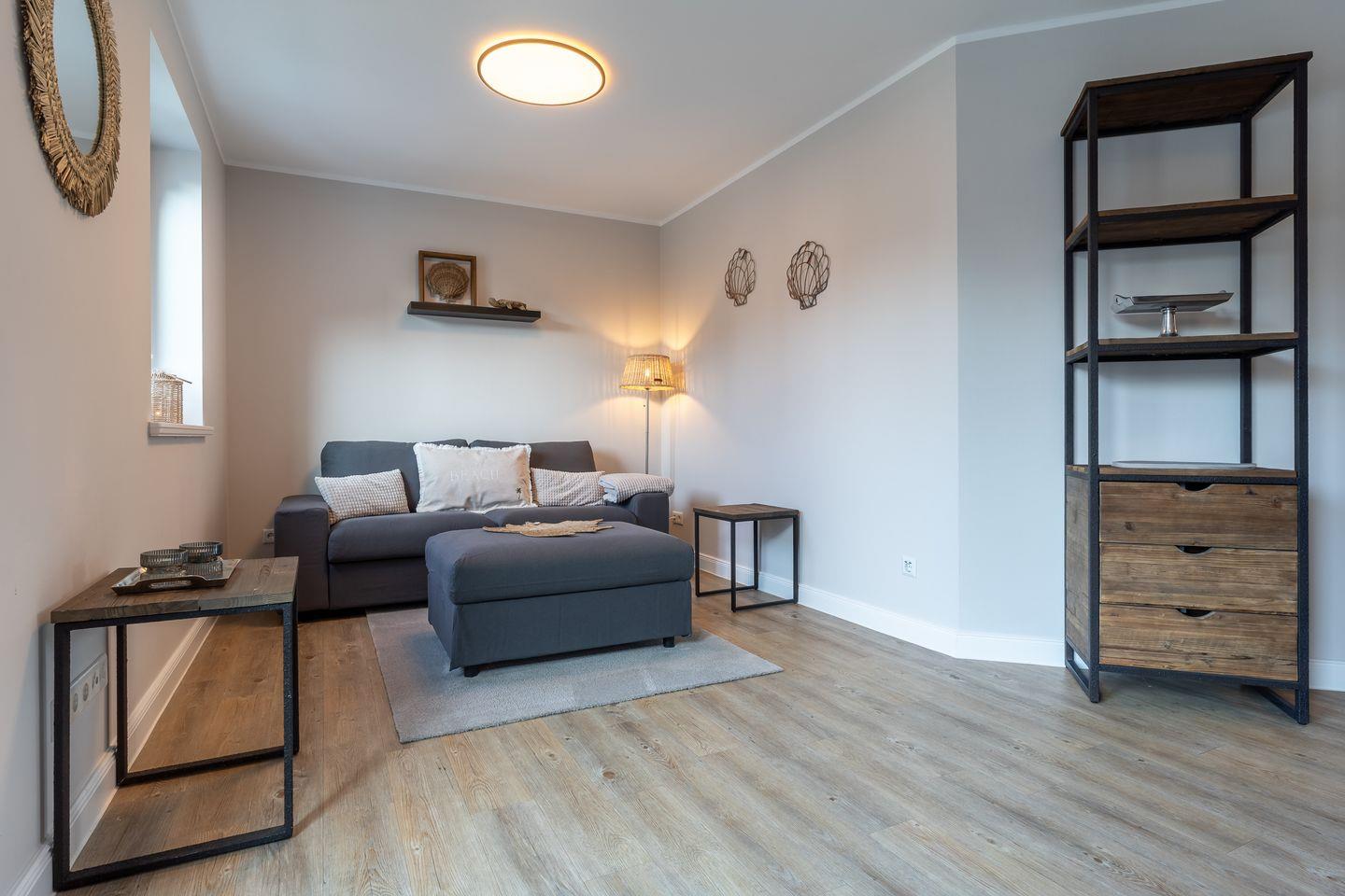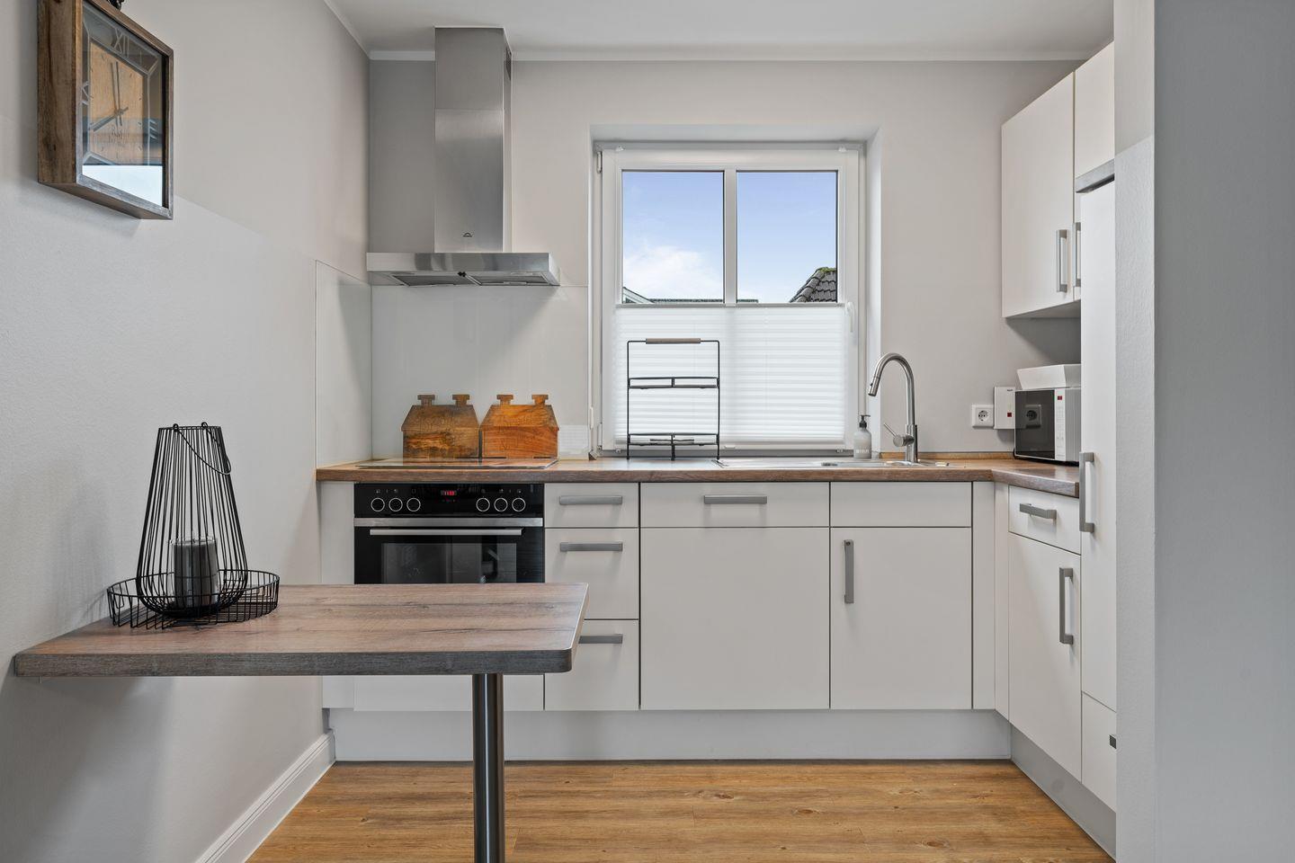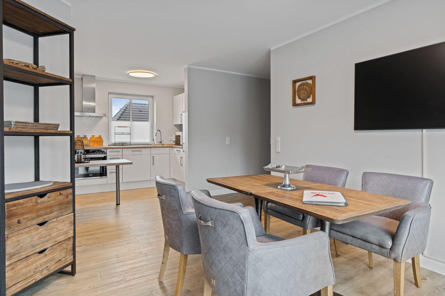 Diese moderne und stilvoll eingerichtete Wohnung bietet auf 60 m² genügend Platz für bis zu drei Personen. Der offene Wohnbereich verbindet Küche und Wohnzimmer harmonisch und ist der perfekte Ort, um sich nach einem erlebnisreichen Tag zu entspannen. Genießen Sie die Zeit bei einem gemütlichen Abendessen, das Sie in der voll ausgestatteten Küche zubereiten können. Hier stehen Ihnen moderne Geräte wie ein Cerankochfeld, Backofen, Kühlschrank mit Gefrierfach, Geschirrspüler, sowie kleine Küchengeräte wie Wasserkocher und Kaffeemaschine zur Verfügung.
