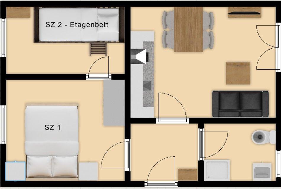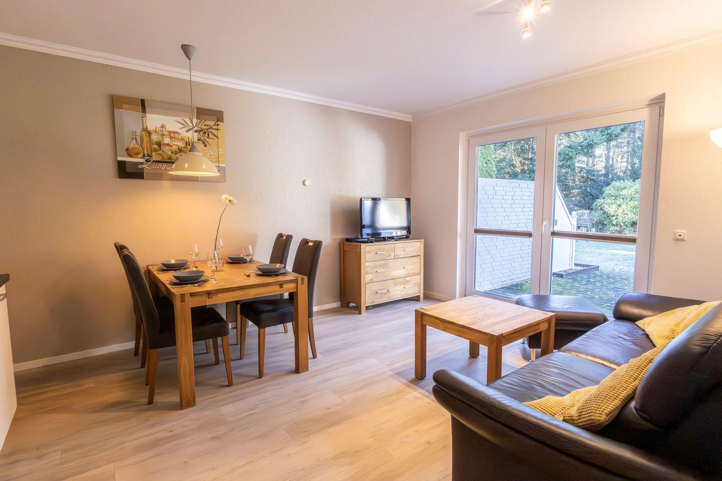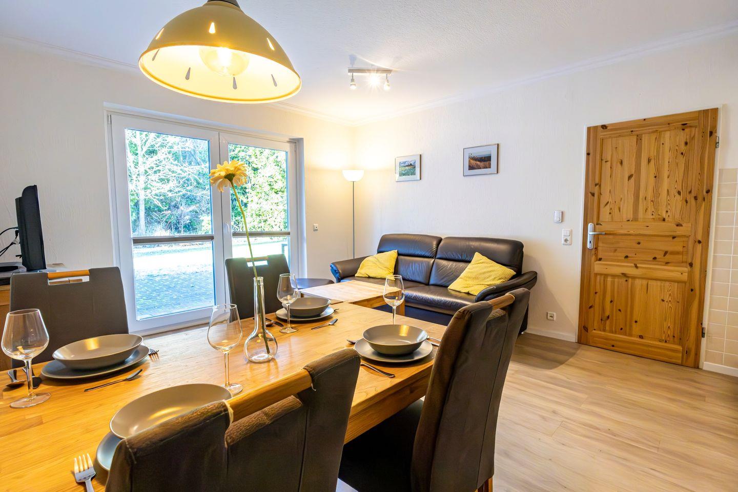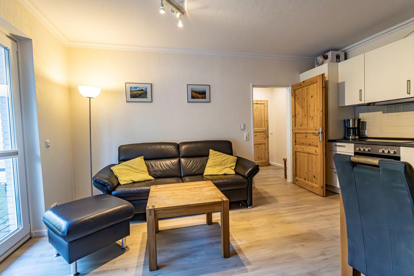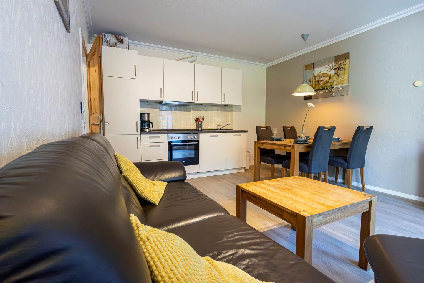 Herzstück der Unterkunft ist der offen gestaltete Wohnbereich, der ein gemütliches Wohnzimmer mit bequemer Sofaecke, TV und integriertem WLAN-Anschluss umfasst. Hier können Sie entspannte Stunden verbringen und den Alltag hinter sich lassen. Die offene Küche schließt direkt an das Wohnzimmer an und ist mit einem Ceranherd, Backofen, Kühlschrank, Toaster, Kaffeemaschine, Wasserkocher sowie allen weiteren notwendigen Küchenutensilien ausgestattet. Ein Esstisch bietet ausreichend Platz für gemeinsame Mahlzeiten. Für einen besonderen Komfort sorgt die Fußbodenheizung, die in allen Räumen für eine angenehme Wärme sorgt.