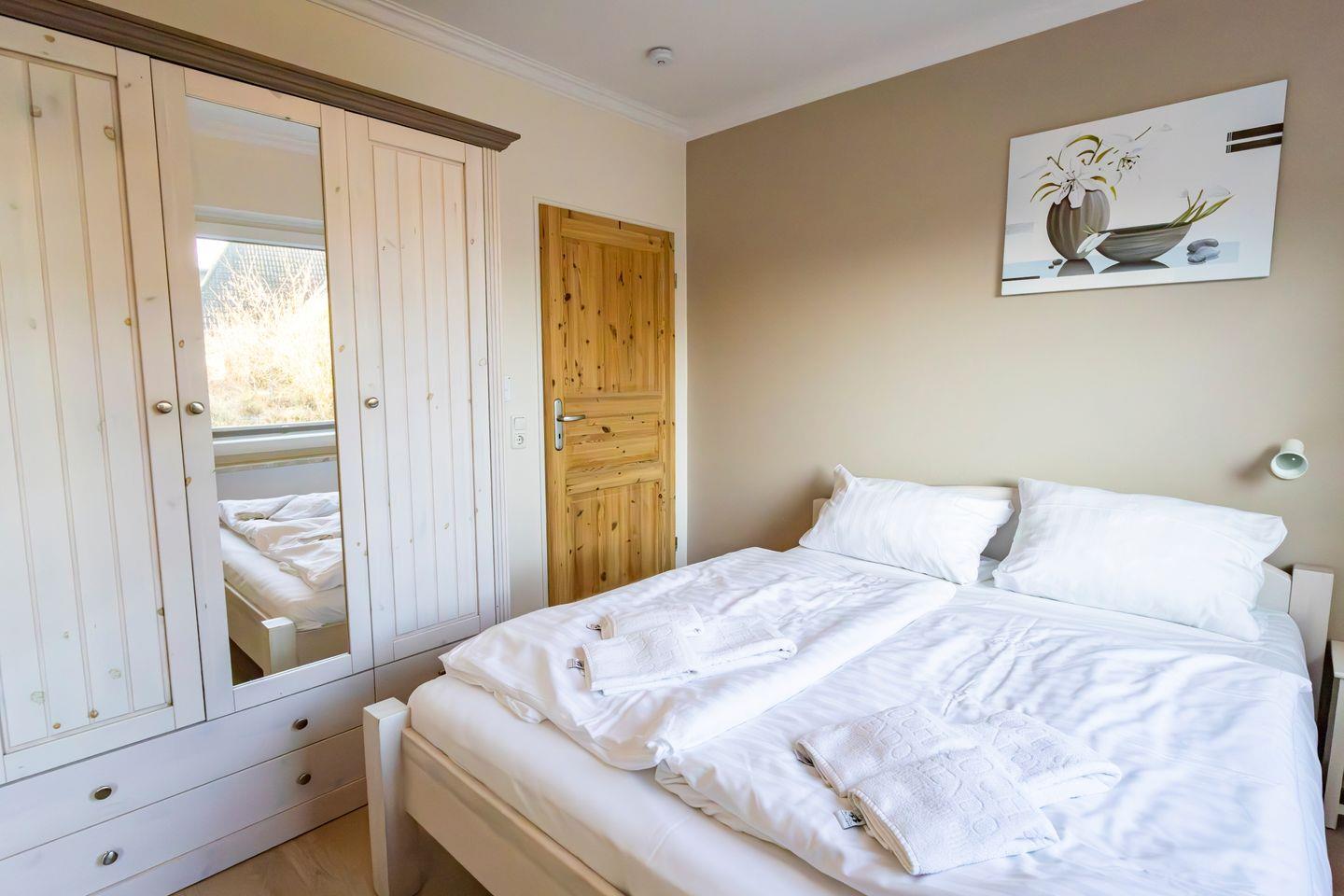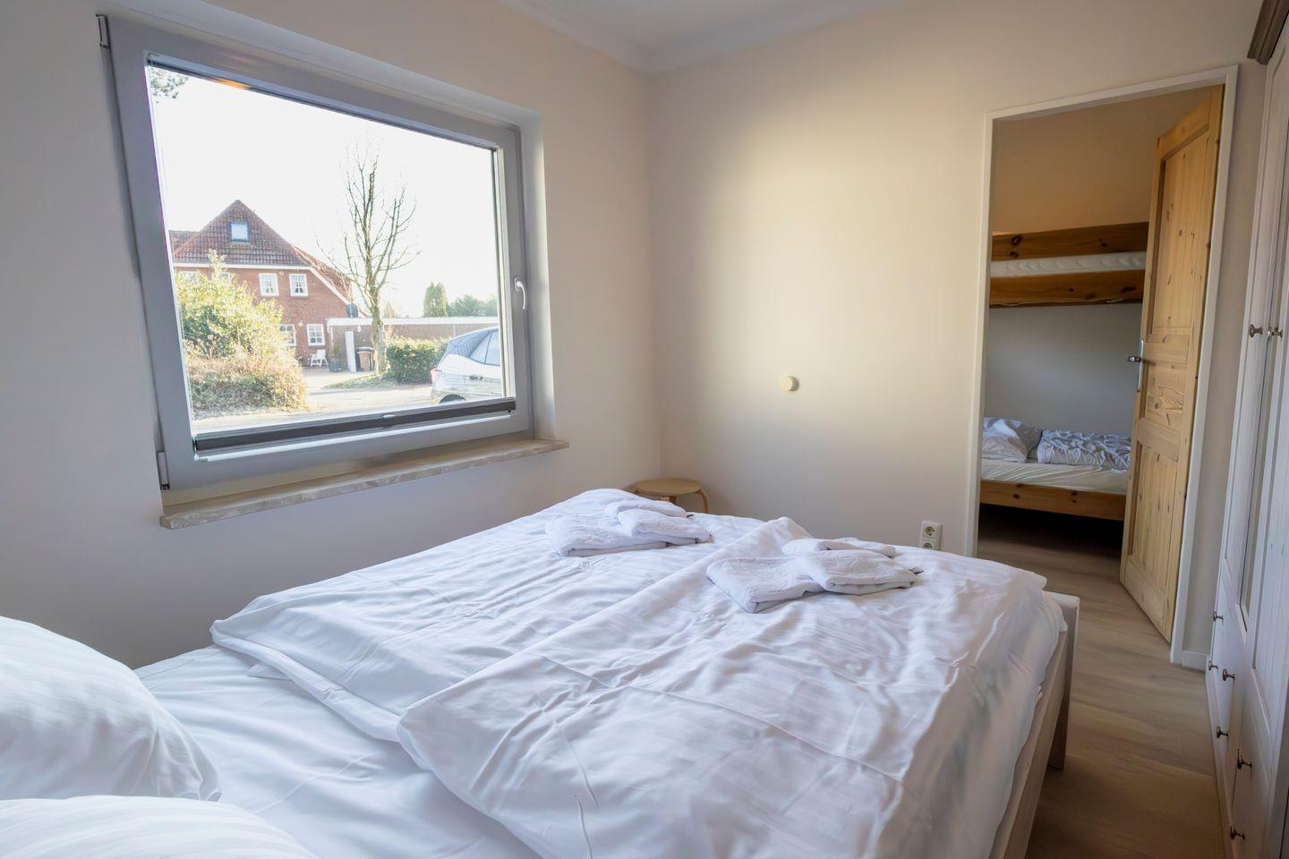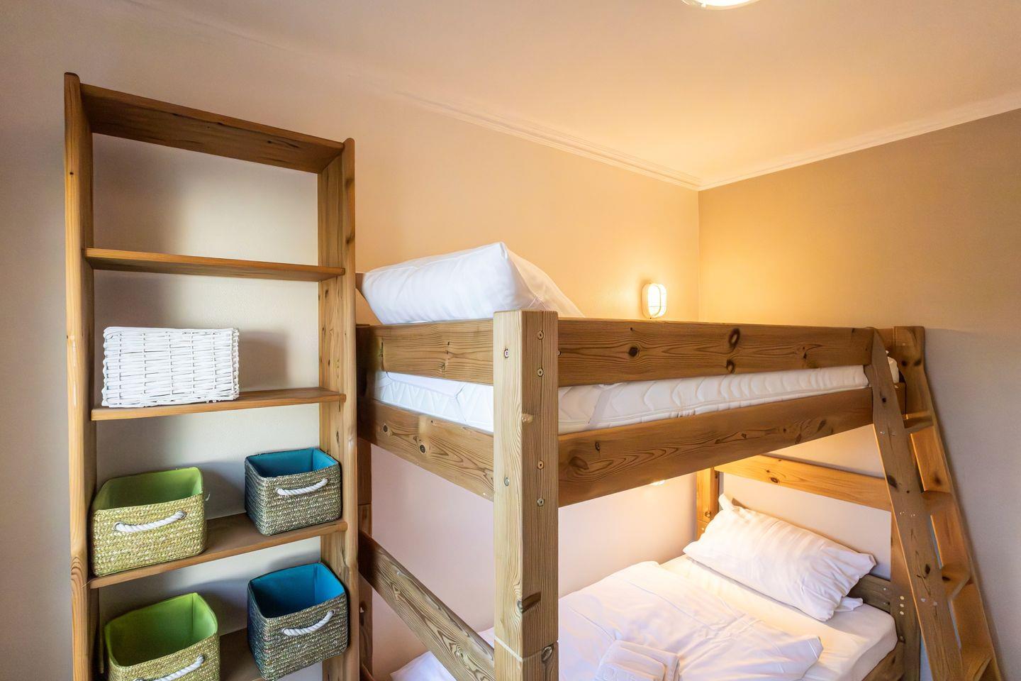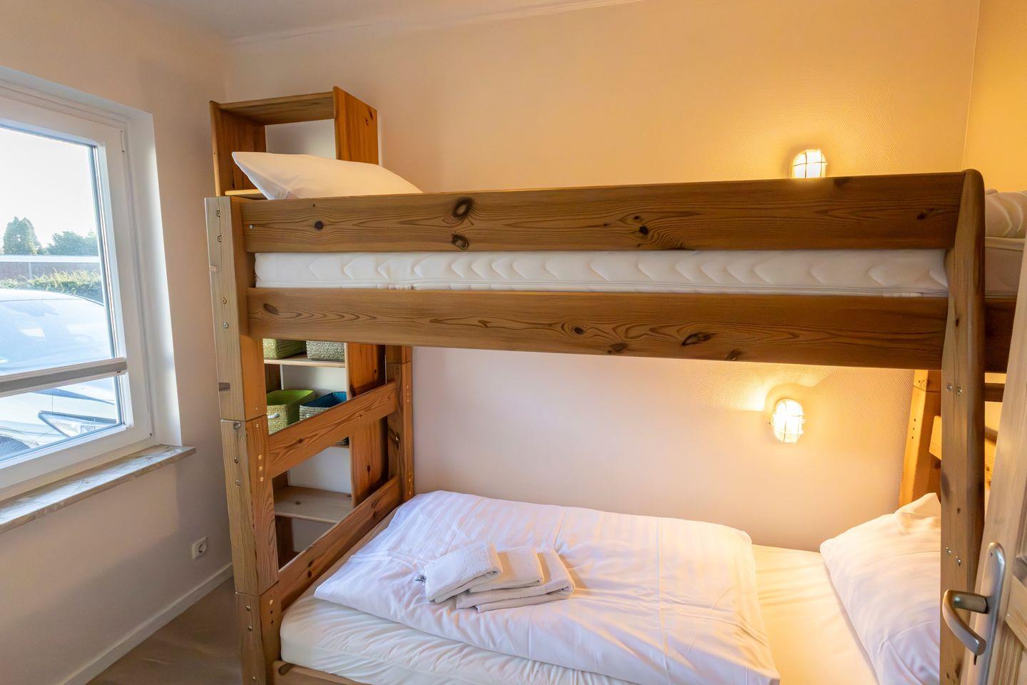 Das separate Schlafzimmer ist mit komfortablen Schlafmöglichkeiten ausgestattet und wird durch Sichtschutz an allen Fenstern abgerundet. Insgesamt finden vier Personen einen Schlafplatz, wobei zwei Schlafmöglichkeiten ausschließlich für Kinder vorgesehen sind. Ein Babybett und ein Kinderhochstuhl stehen für die jüngsten Gäste bereit, sodass auch Familien mit Kleinkindern bestens versorgt sind.