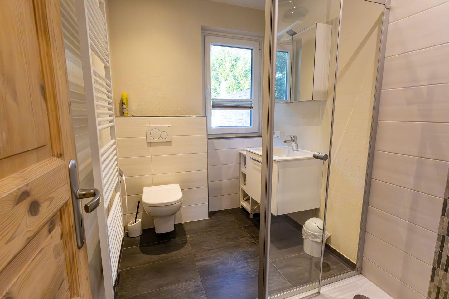 Im modernen Badezimmer mit Fenster stehen Ihnen Dusche, WC, Waschbecken, Spiegel, Haartrockner und Warmwasser zur Verfügung. Ebenfalls vorhanden sind eine Waschmaschine und ein Trockner, die Ihnen zusätzliche Flexibilität bei längeren Aufenthalten bieten.