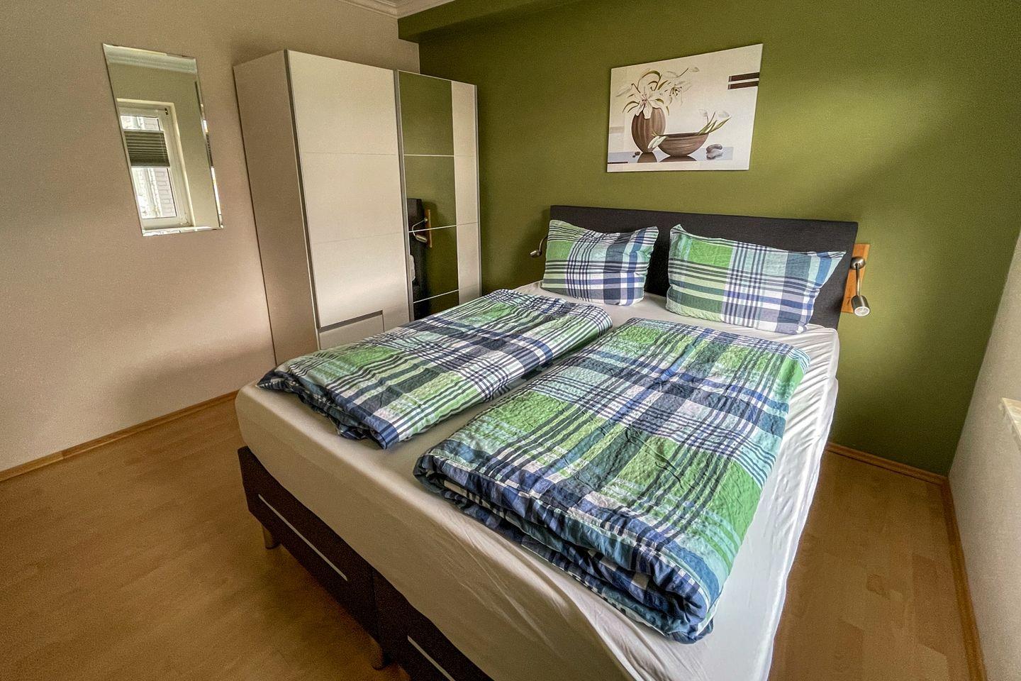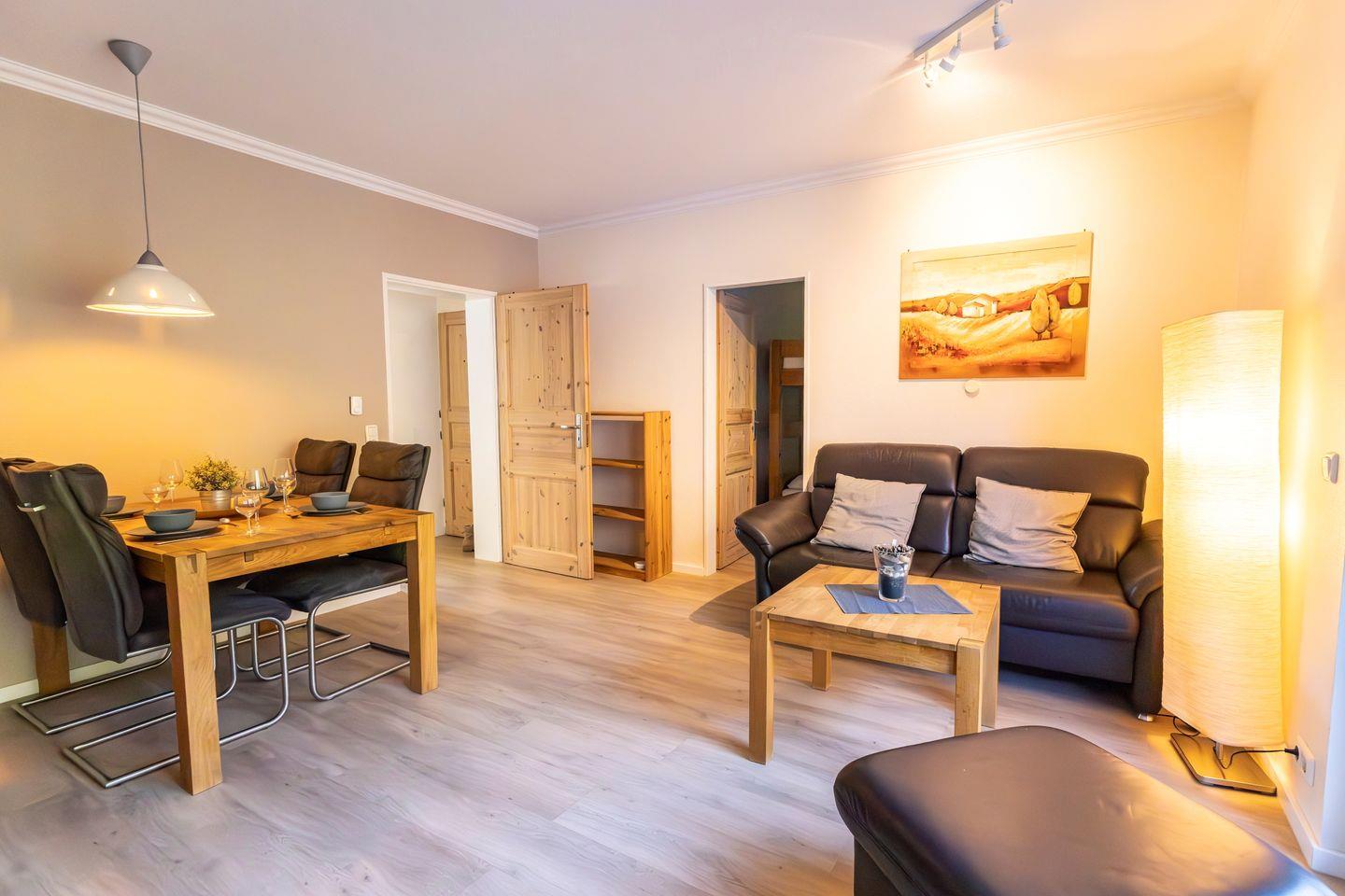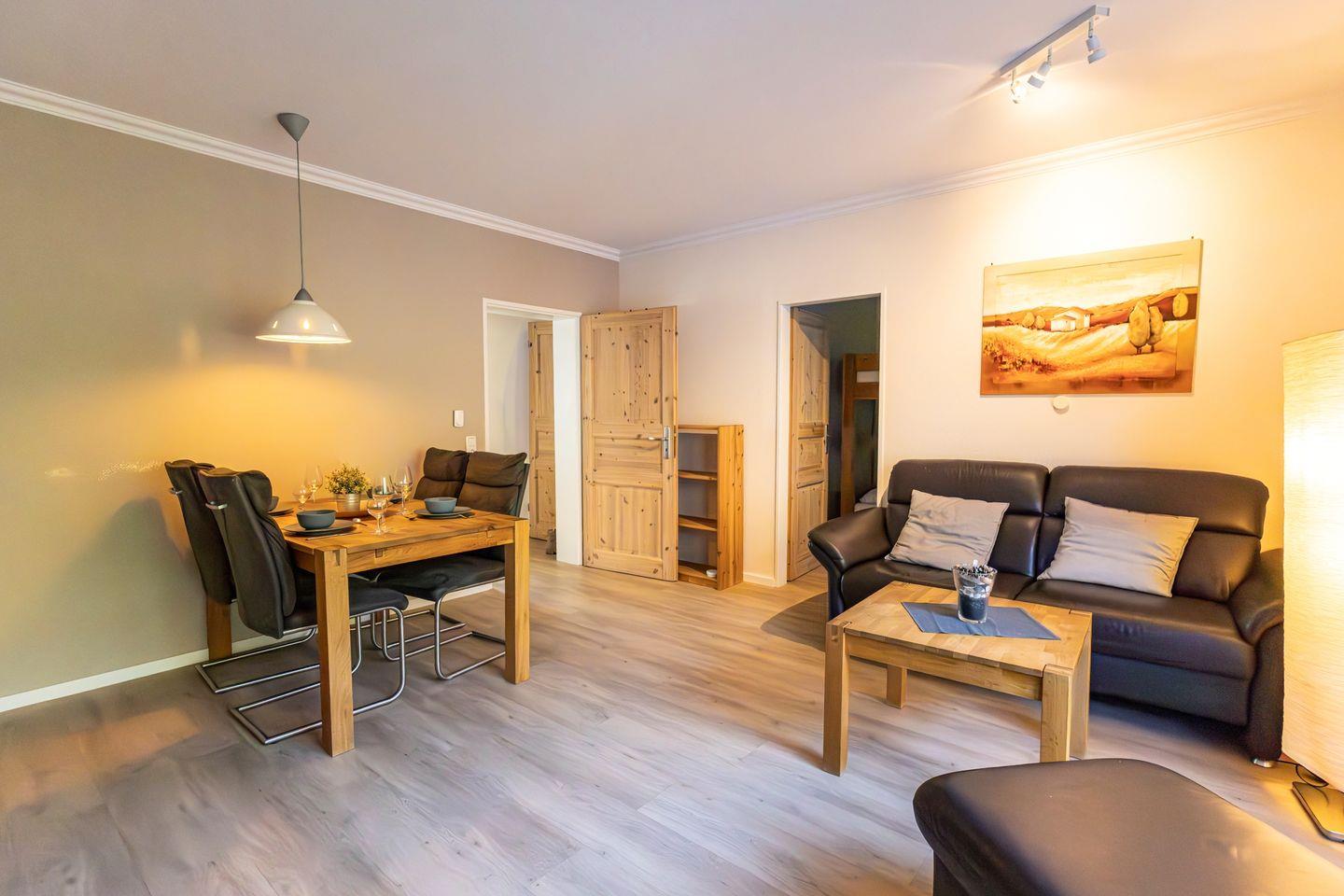 Das modern und funktional eingerichtete Appartement eignet sich aufgrund seiner Aufteilung optimal für bis zu vier Personen. Zur Verfügung steht ein separates Schlafzimmer, das Rückzug und Erholung ermöglicht. Neben dem komfortablen Schlafbereich finden Sie im Wohnzimmer eine zusätzliche Schlafmöglichkeit, ausgestattet mit einem gemütlichen Sofa und ausreichend Sichtschutz an allen Fenstern.