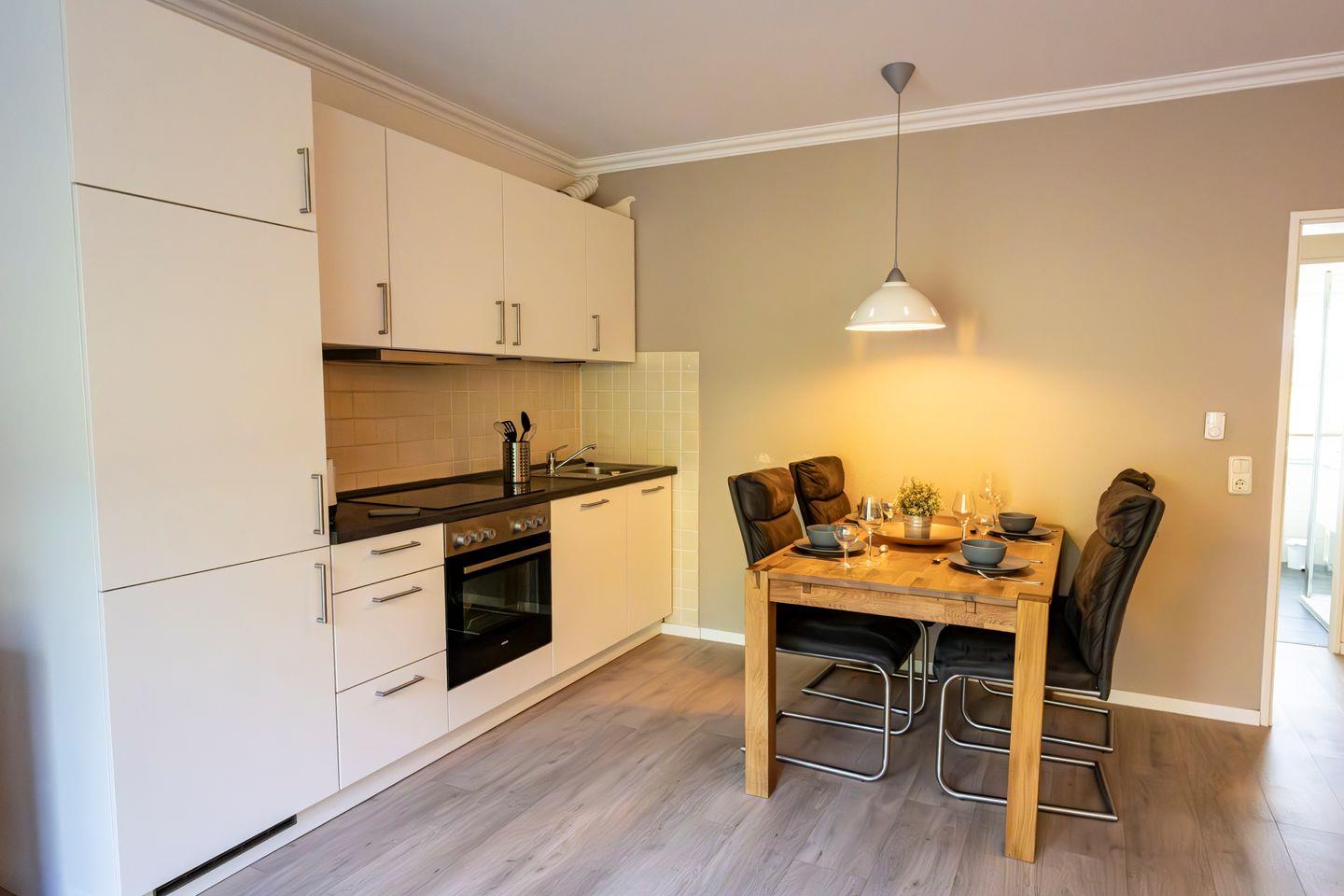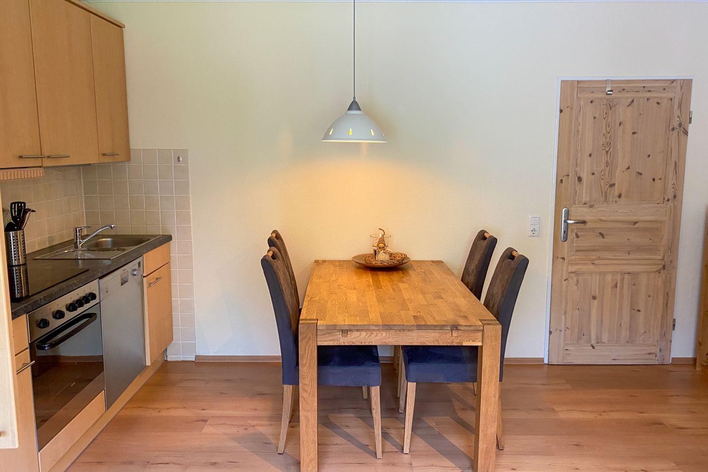Die offene Küche ist zum Wohnbereich hin gestaltet und überzeugt mit ihrer vollständigen Ausstattung. Sie finden einen Ceranherd, einen Backofen, Toaster, Kaffeemaschine, Wasserkocher, einen Kühlschrank sowie alle wesentlichen Küchenutensilien und Geschirrhandtücher. Der Essbereich ist im Wohnzimmer integriert und bietet einen Esstisch, an dem Sie gemeinsam Ihre Mahlzeiten einnehmen können.