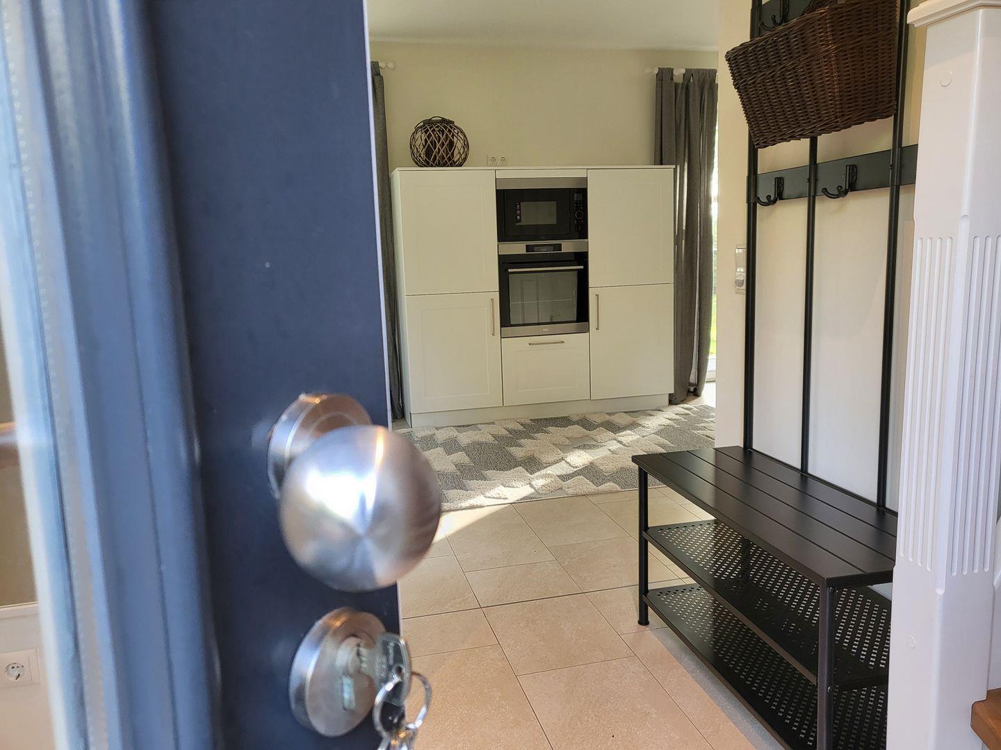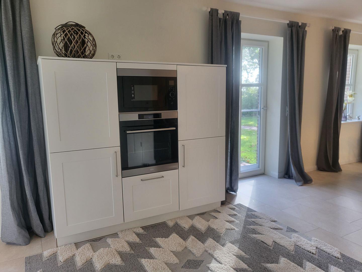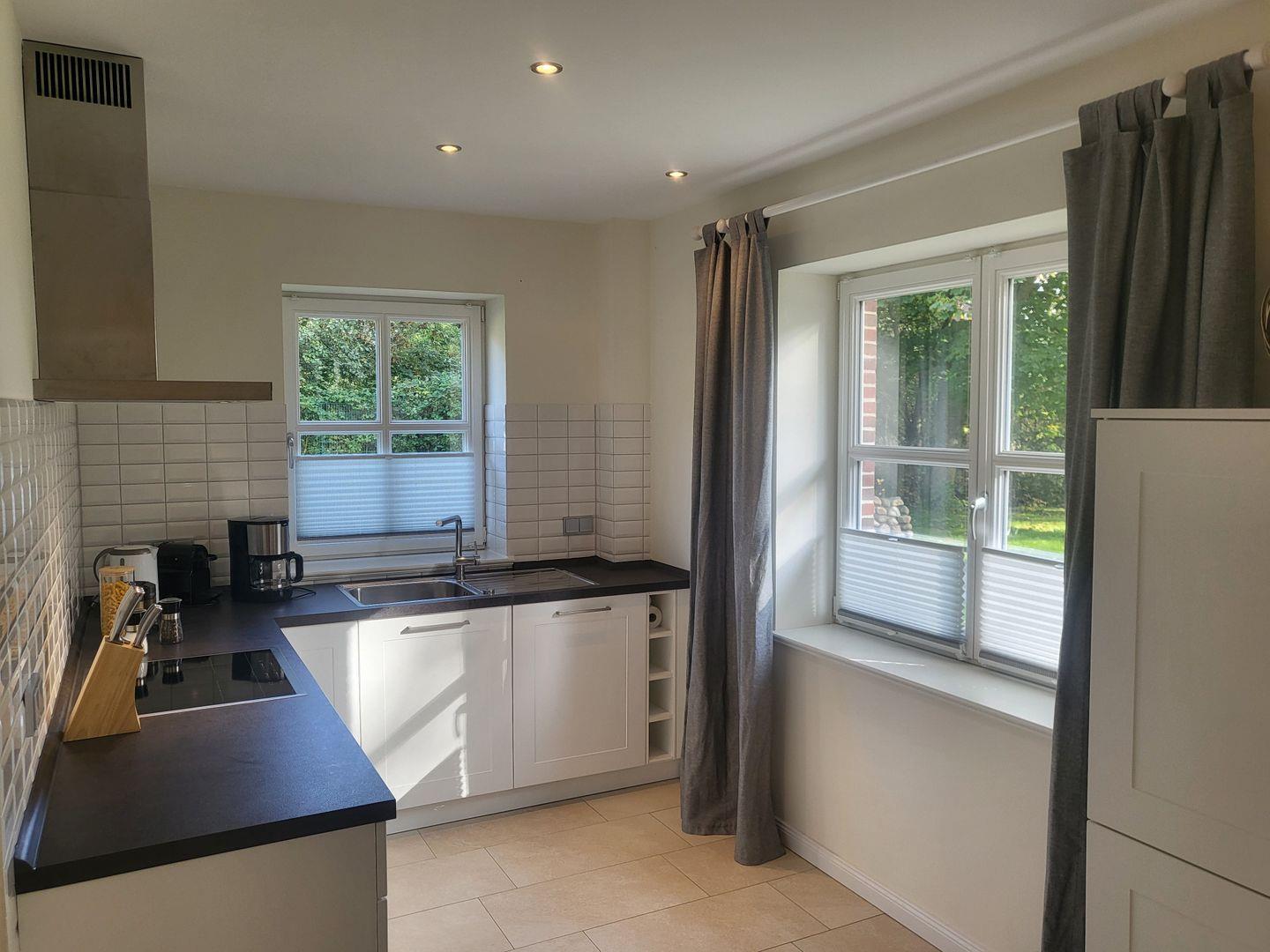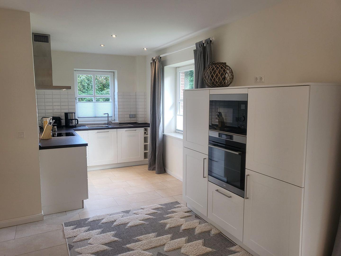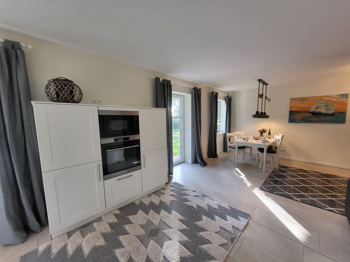 Die offene Küche ist hochwertig ausgestattet und schließt an den Essbereich an. Sie verfügt über einen Induktionsherd, Backofen, Mikrowelle, Spülmaschine, Kühlschrank mit Gefrierfach, Wasserkocher, Toaster, Kaffeemaschine sowie umfangreiche Utensilien für die Zubereitung aller Mahlzeiten. Der Essbereich mit Esstisch lädt zu gemeinsamen Mahlzeiten ein.