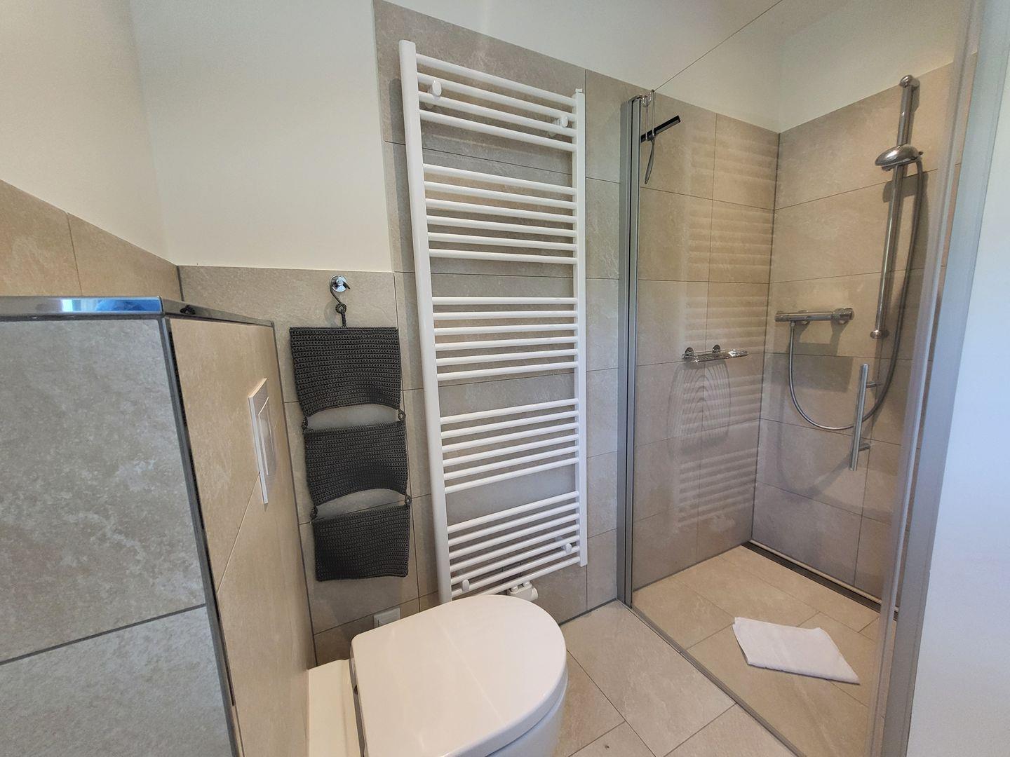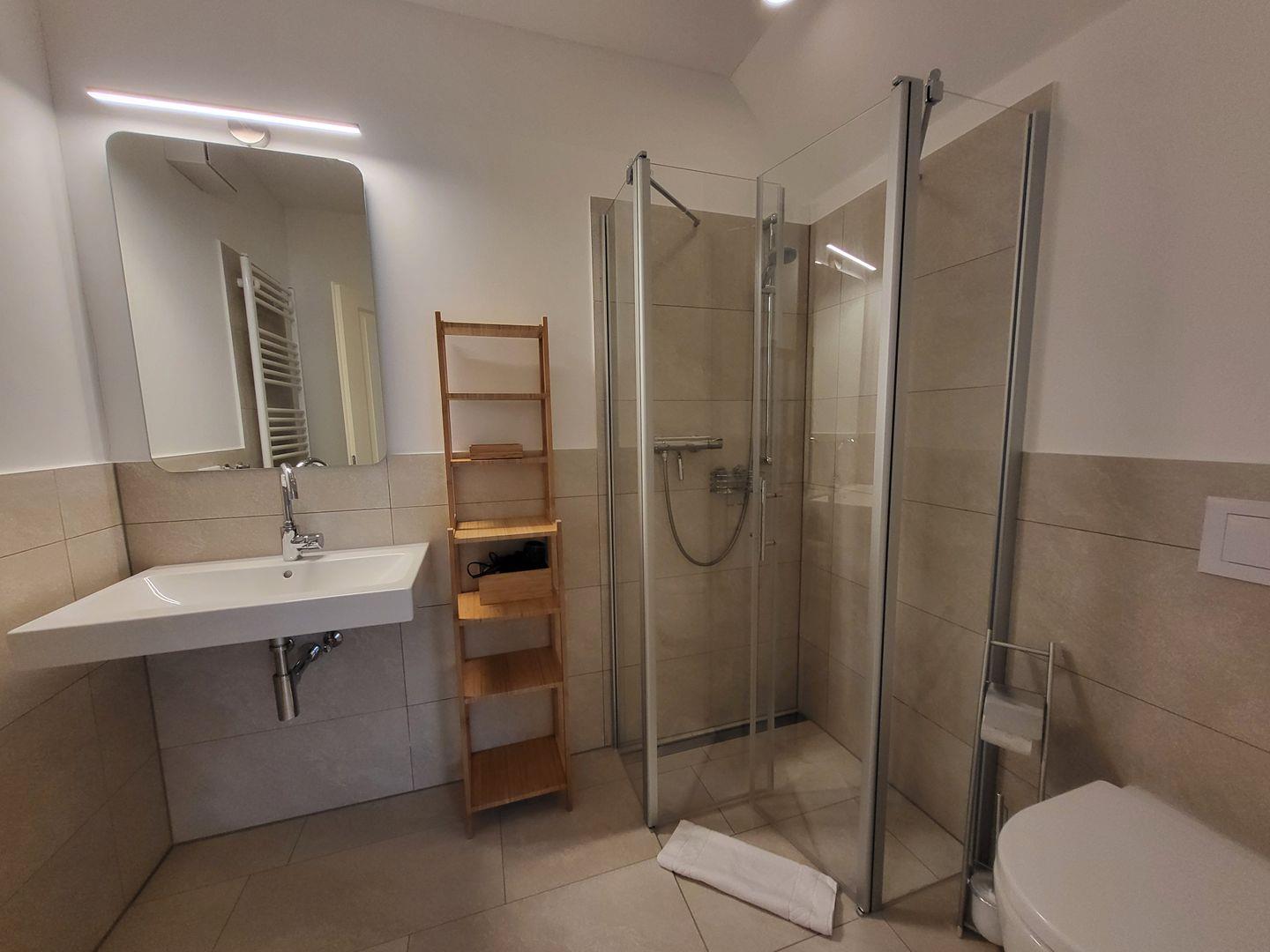 Zwei moderne Badezimmer mit bodengleichen Duschen und Spiegeln sorgen für Komfort und Privatsphäre. Eines davon befindet sich im EG und das andere im OG. Die gemeinschaftlichen Waschmaschine und Trockner bieten Flexibilität bei längeren Aufenthalten und sind bequem nutzbar.