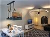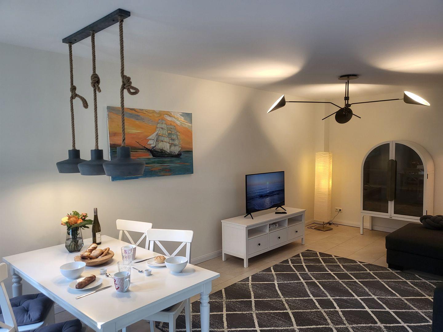 Die Einrichtung folgt einer modernen, dennoch historischen und gemütlichen Linie. Der offene Grundriss verbindet das Wohnzimmer mit der offenen Küche und dem Essbereich. Im Wohnraum sorgt eine gemütliche Sofaecke für behagliche Stunden. Zur Ausstattung gehören ein Smart-TV mit digitalem Satellitenanschluss und WLAN, sodass sowohl Unterhaltung als auch die Möglichkeit zum Arbeiten jederzeit gegeben sind.