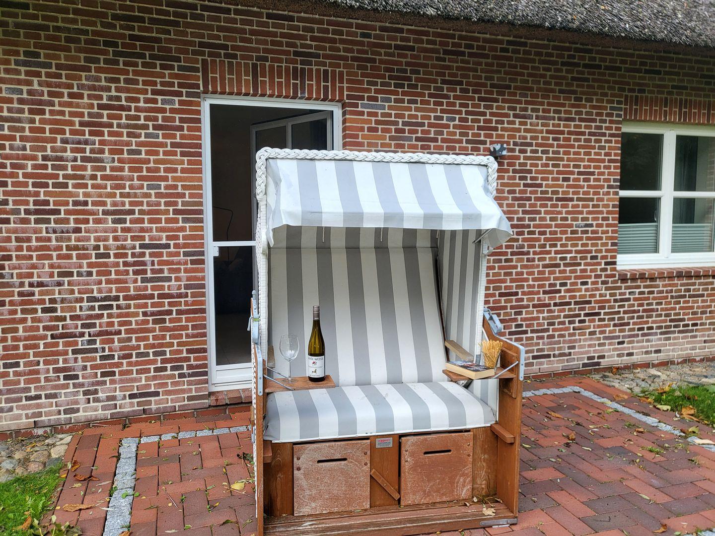 Im Außenbereich steht Ihnen eine Terrasse zur Verfügung. Hier erwarten Sie komfortable Gartenmöbel in den Sommermonaten sowie ein Strandkorb, ideal um die frische Nordseeluft und den herrlichen Gartenblick zu genießen. Auch ein gemeinschaftlicher Garten ist vorhanden – ideal für Kinder zum Spielen. Für Familien mit Babys steht die Unterkunft offen, und auch ältere Kinder sind herzlich willkommen.