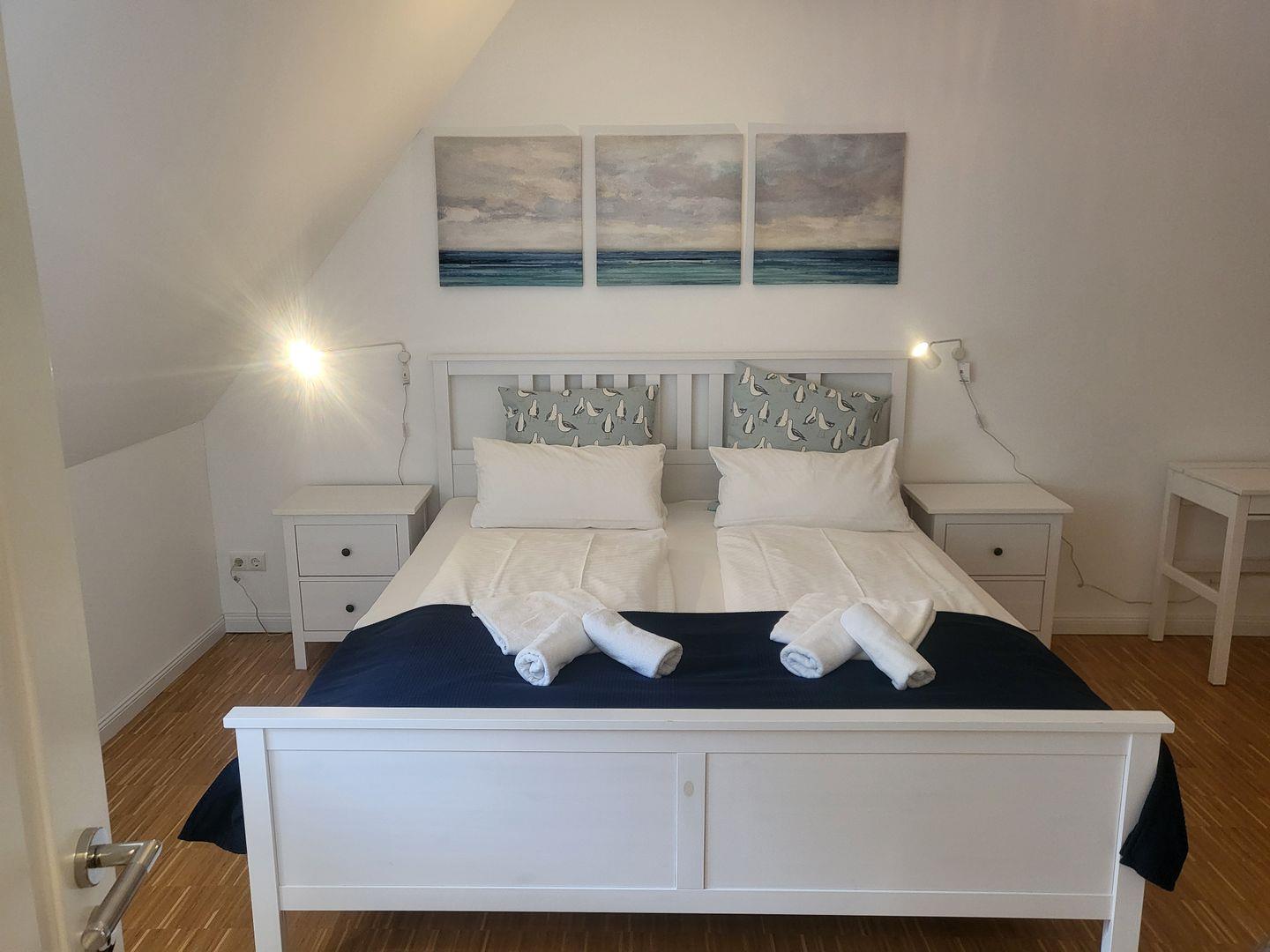 Die beiden Schlafzimmer im OG. sind mit hochwertigen Vinylböden ausgelegt und bieten ebenso wie das Wohnzimmer ausreichend Stauraum durch Kommoden. Die Schlafmöglichkeiten sind insgesamt für vier Personen ausgelegt; auf Zustellbetten wurde bewusst verzichtet, wodurch ein angenehmes Raumgefühl entsteht. In beiden Schlafzimmern profitieren Sie von einer angenehmen und allergikerfreundlichen Umgebung.