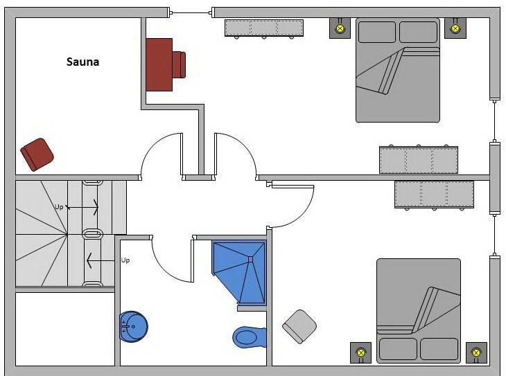 Obergeschoss: 2 Schlafzimmer mit Doppelbett (je 180 x 200 cm), ein Duschbad / WC, eine Sauna