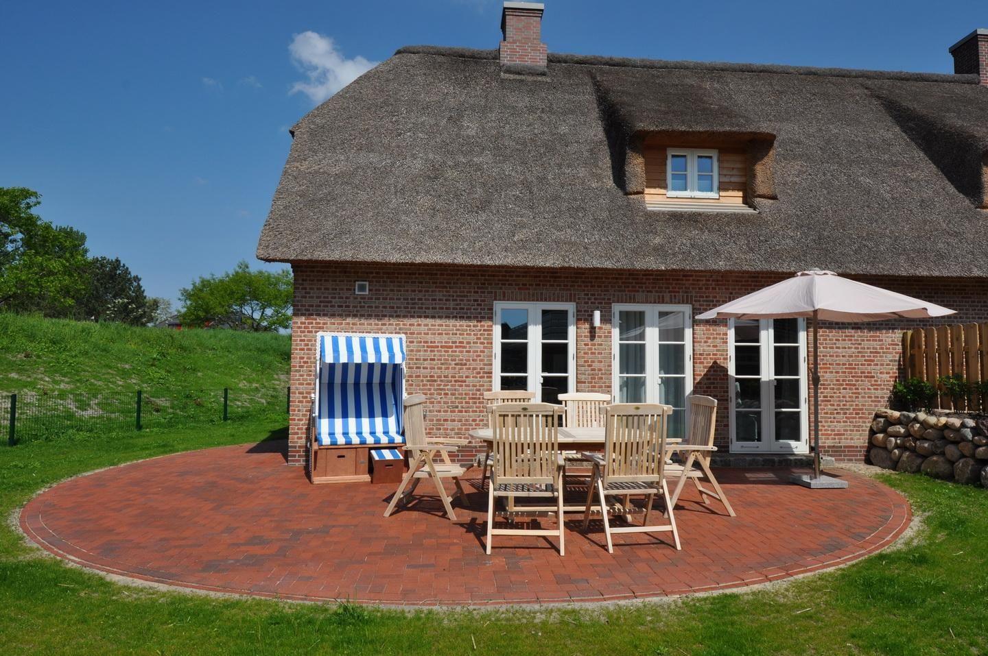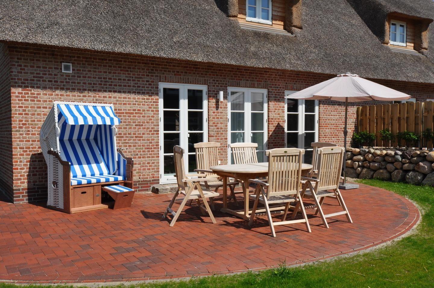 Auf der Terrasse stehen Gartenmöbel und ein Strandkorb bereit.