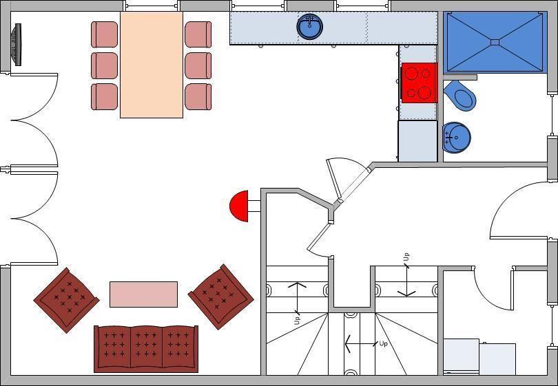 Erdgeschoss: Eingangsbereich, Wohnraum mit integrierter Küche, Kamin und Zugang zur Terrasse, ein Duschbad / WC, ein Hauswirtschaftsraum