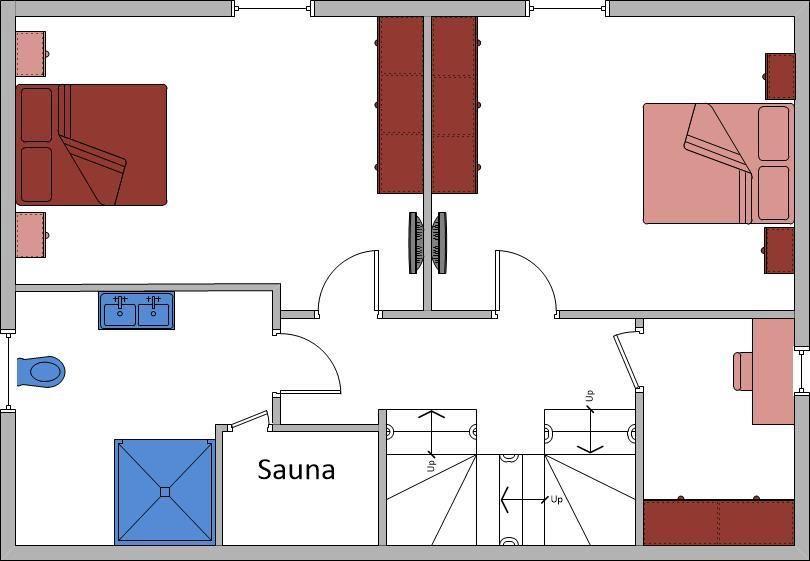 Obergeschoss: 2 Schlafzimmer (je 160 x 200 cm - Einzelmatratzen) jeweils mit Doppelbett und TV, ein kleines Büro, ein Duschbad / WC mit integrierter Sauna