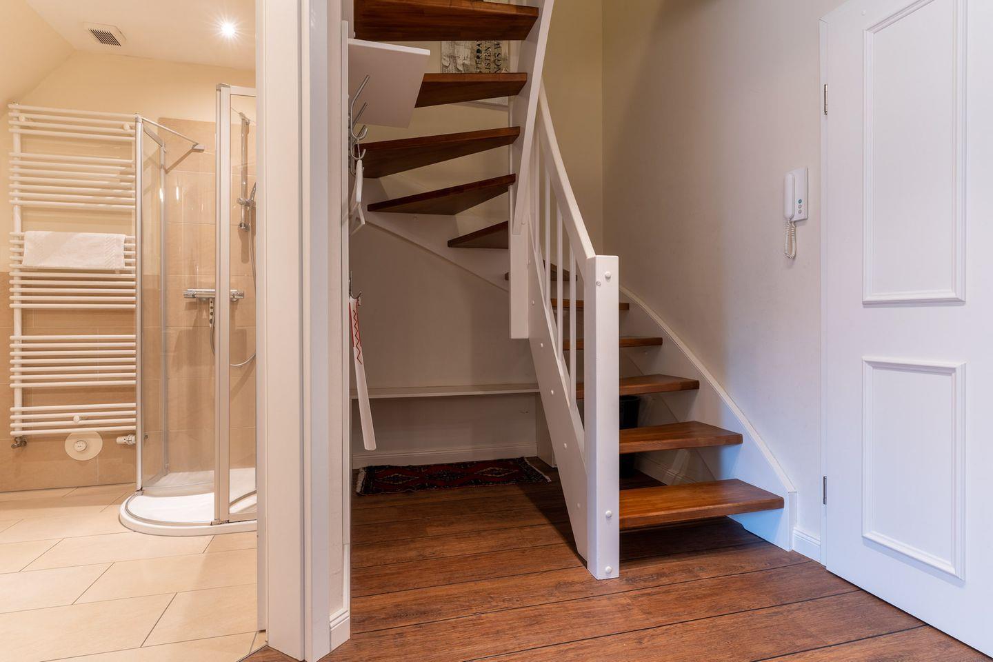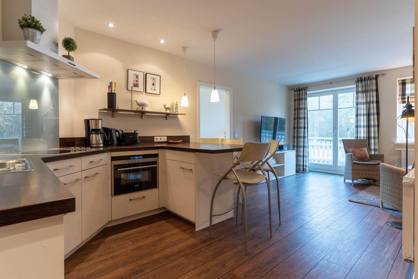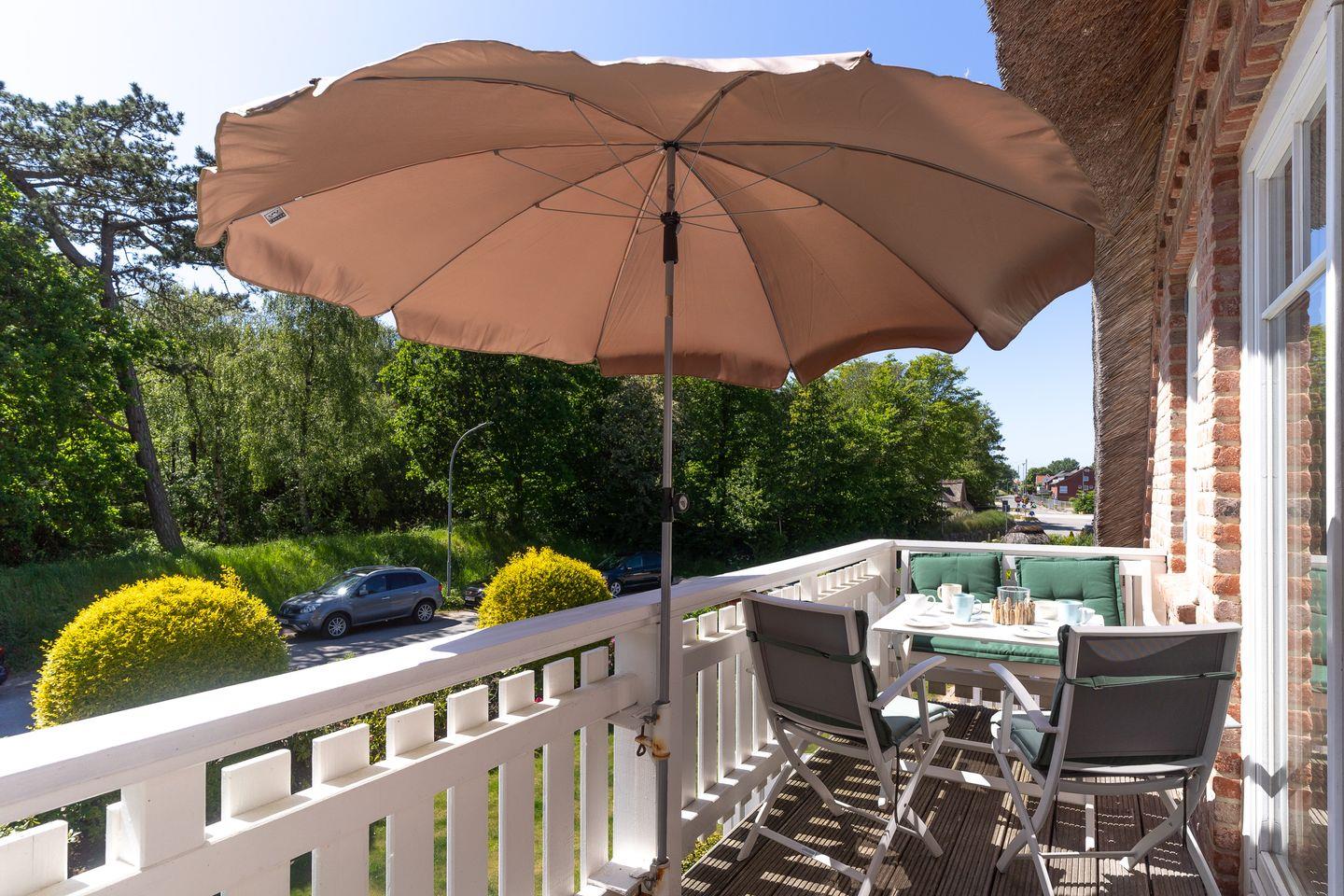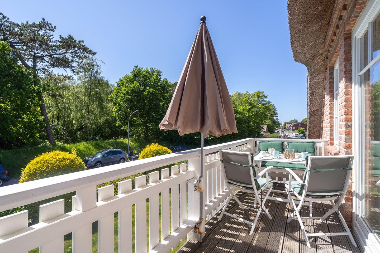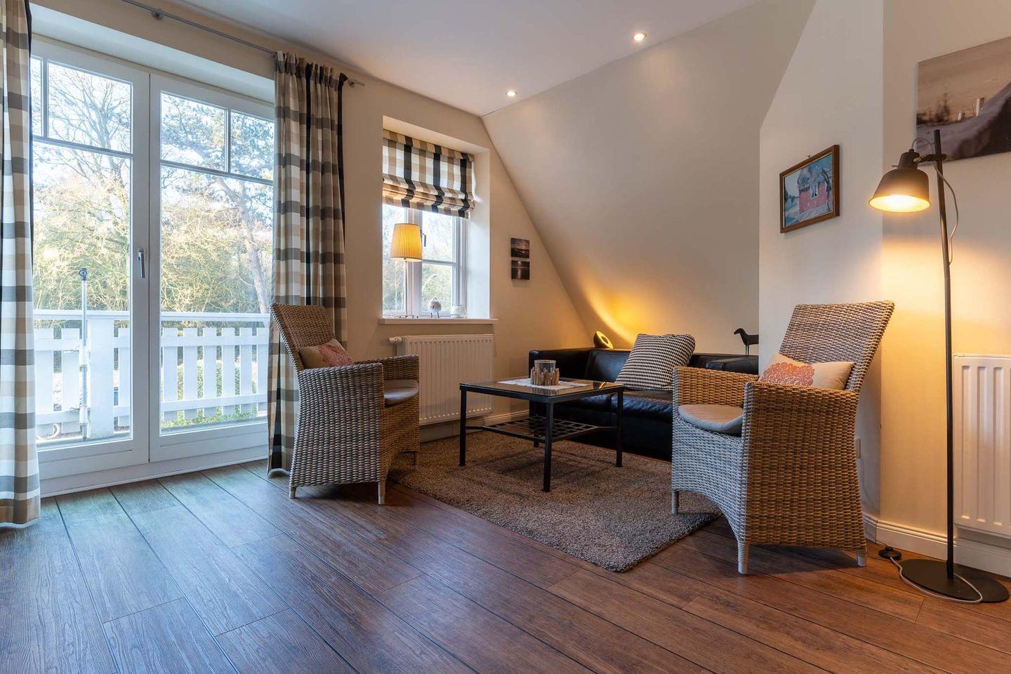 Das wunderschöne Apartment unter Reet wurde mit exklusiven Möbeln ausgestattet und bietet großzügigen Platz für 4 Personen. Das Grundstück mit Stellplatz wurde mit hübschen Pflanzen und einem Friesenwall angelegt. Das Apartment befindet sich im Obergeschoss und verfügt über ca. 80 m² Wohnfläche und teilt sich wie folgt auf: Auf der ersten Etage befindet sich ein großzügiger Wohnraum mit einer offenen Küche und einem gemütlichen Essbereich mit einem angrenzenden Balkon in Südausrichtung. Die Küche ist mit hochwertigen Geräten voll ausgestattet. Ein separates Duschbad bietet jeden Komfort. Im stilvollen Schlafzimmer mit 1,8 x 2,0 m Doppelbett können Sie herrlich entspannen. Über eine Treppe gelangen Sie in das Dachgeschoss, wo sich ein weiteres Schlafzimmer mit 2 Einzelbetten und einer gemütlichen Sitzecke sowie TV befindet. Mit viel Liebe zum Detail wurde großen Wert auf die Inneneinrichtung gelegt. Carpe Diem!