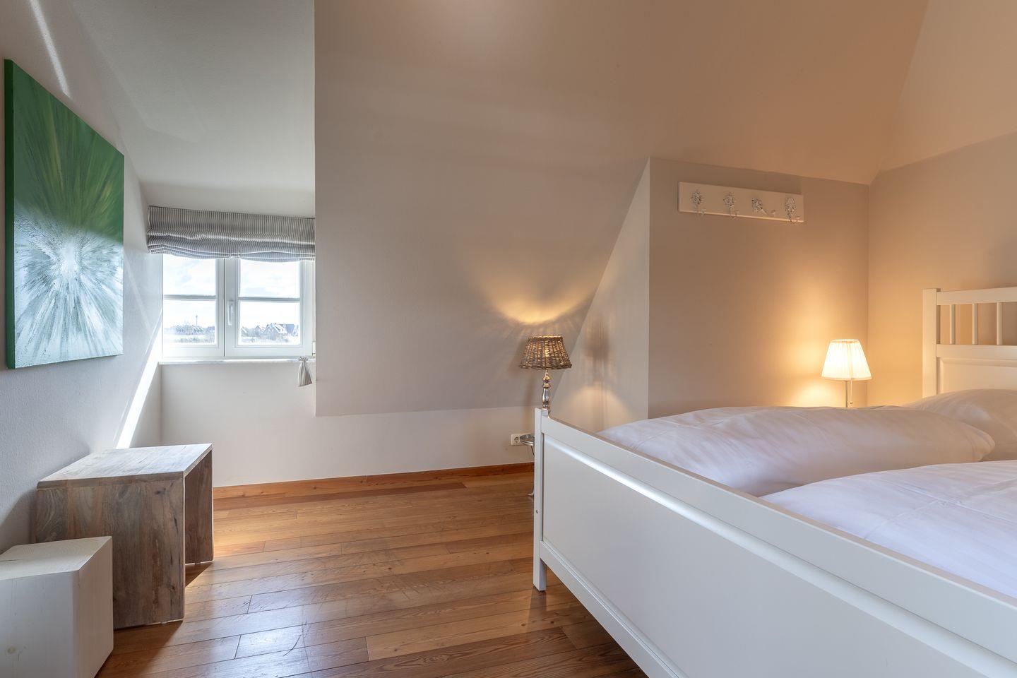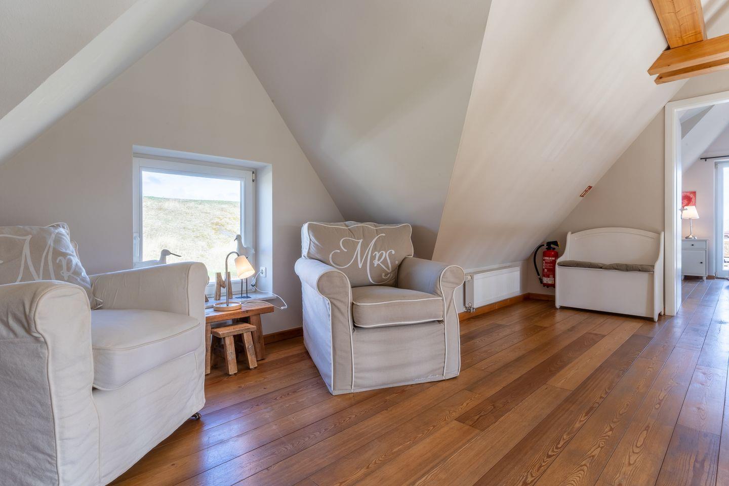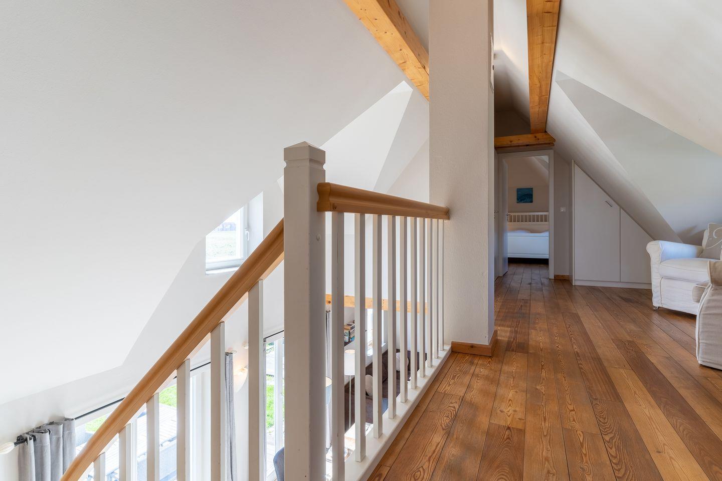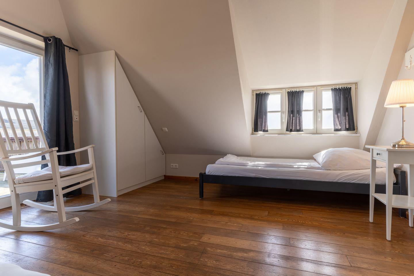 Eine große Dachterrasse schließt sich an eines der beiden Doppelschlafzimmer im 1. OG an. Von beiden Zimmern können Sie den Blick auf den Deich und den Sonnenuntergang genießen. In den Zimmern im ersten Stock und der Galerie wurden Holzdielen verlegt. Seinen Charme erhält der obere Teil auch durch seine gemütlichen Dachschrägen.
