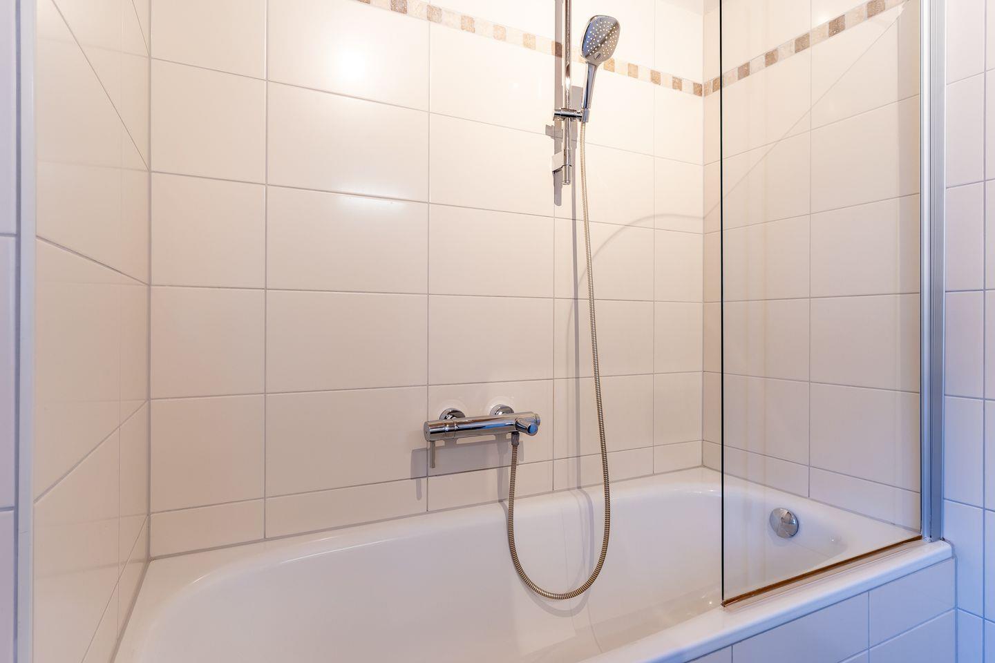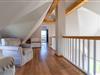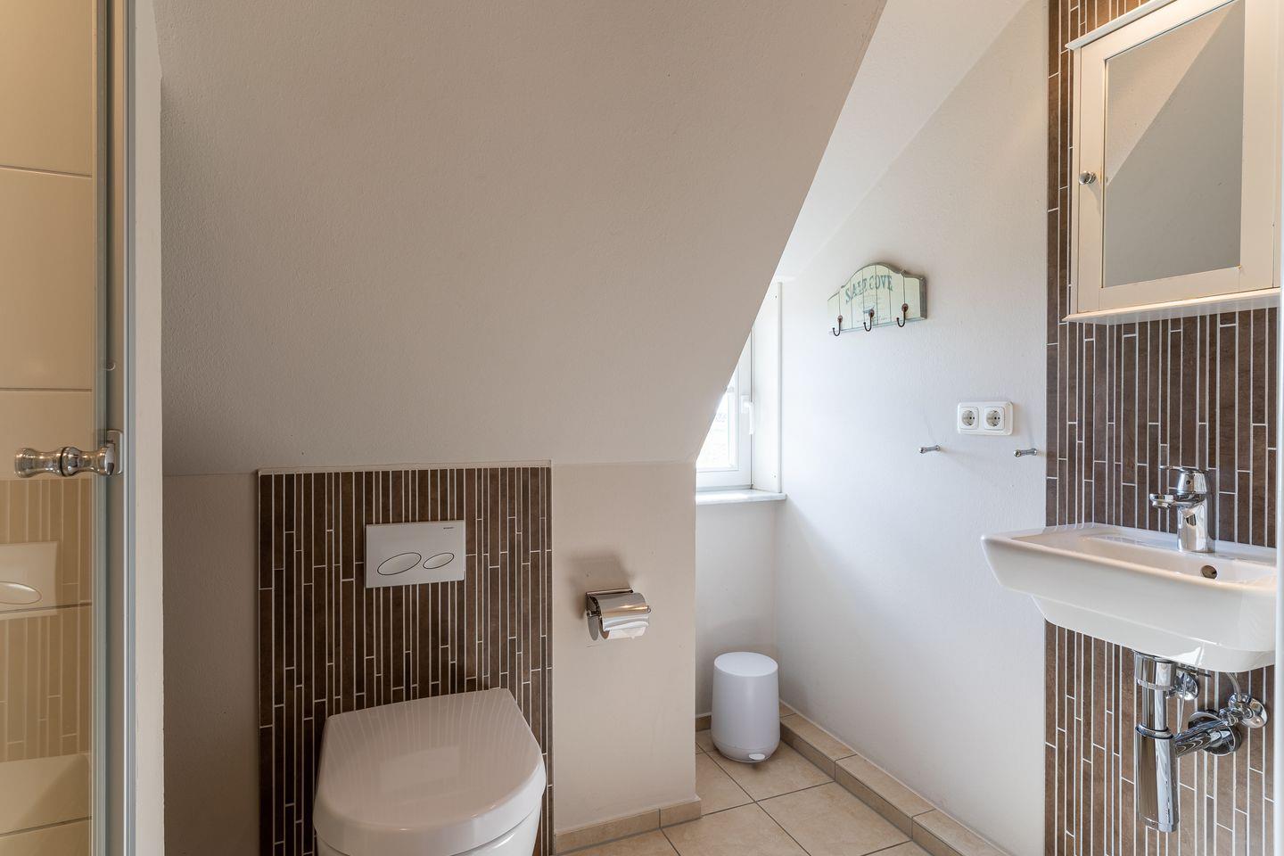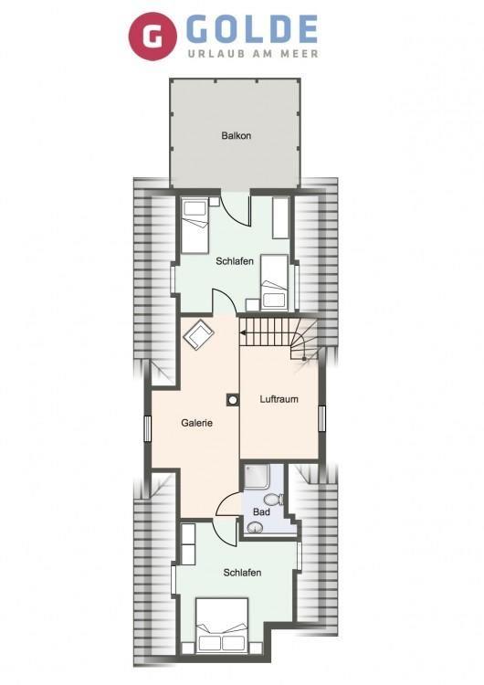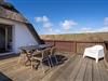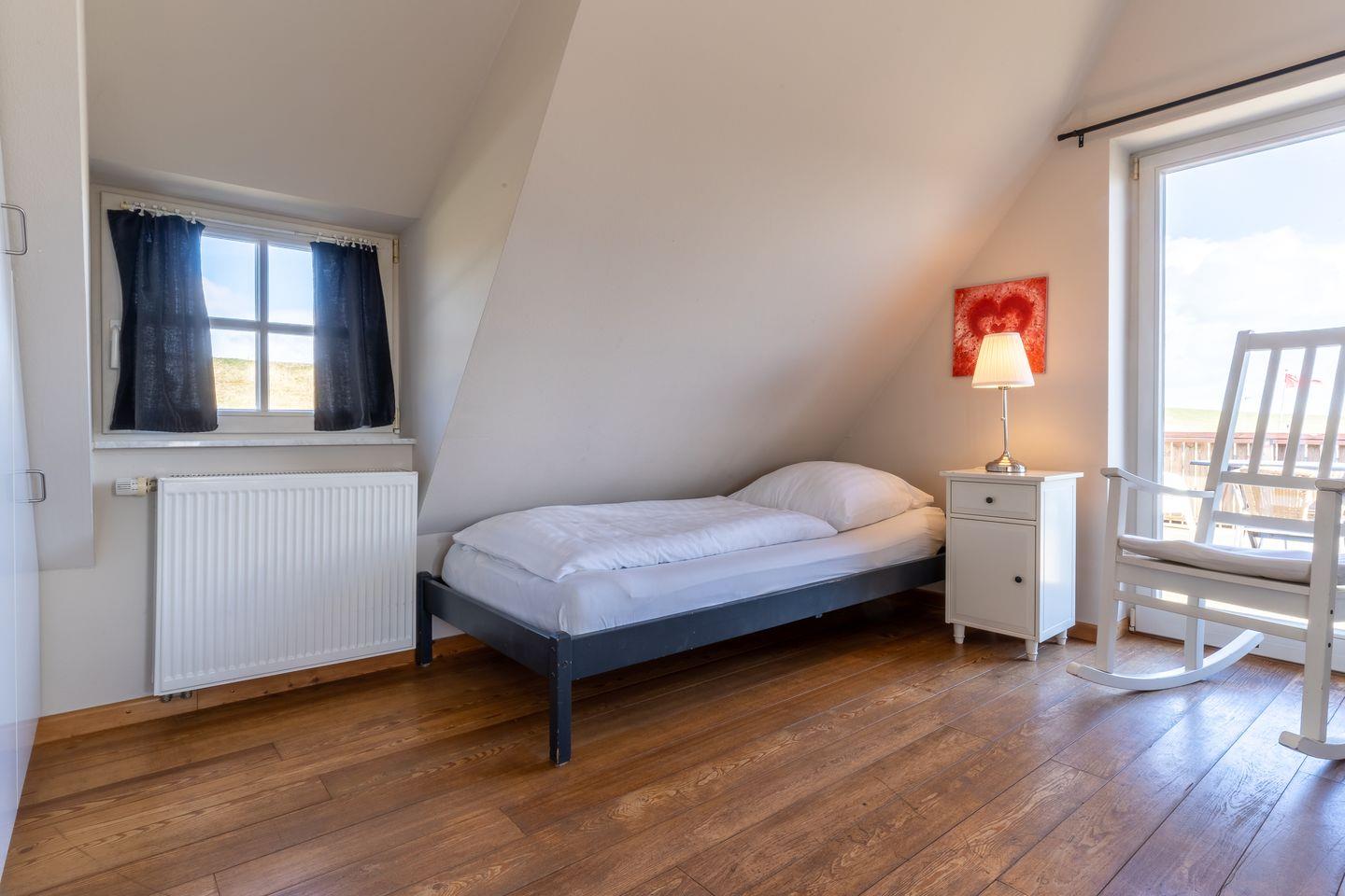 Eine große Dachterrasse schließt sich an eines der beiden Doppelschlafzimmer im 1. OG an. Von beiden Zimmern können Sie den Blick auf den Deich und den Sonnenuntergang genießen. In den Zimmern im ersten Stock und der Galerie wurden Holzdielen verlegt. Seinen Charme erhält der obere Teil auch durch seine gemütlichen Dachschrägen.