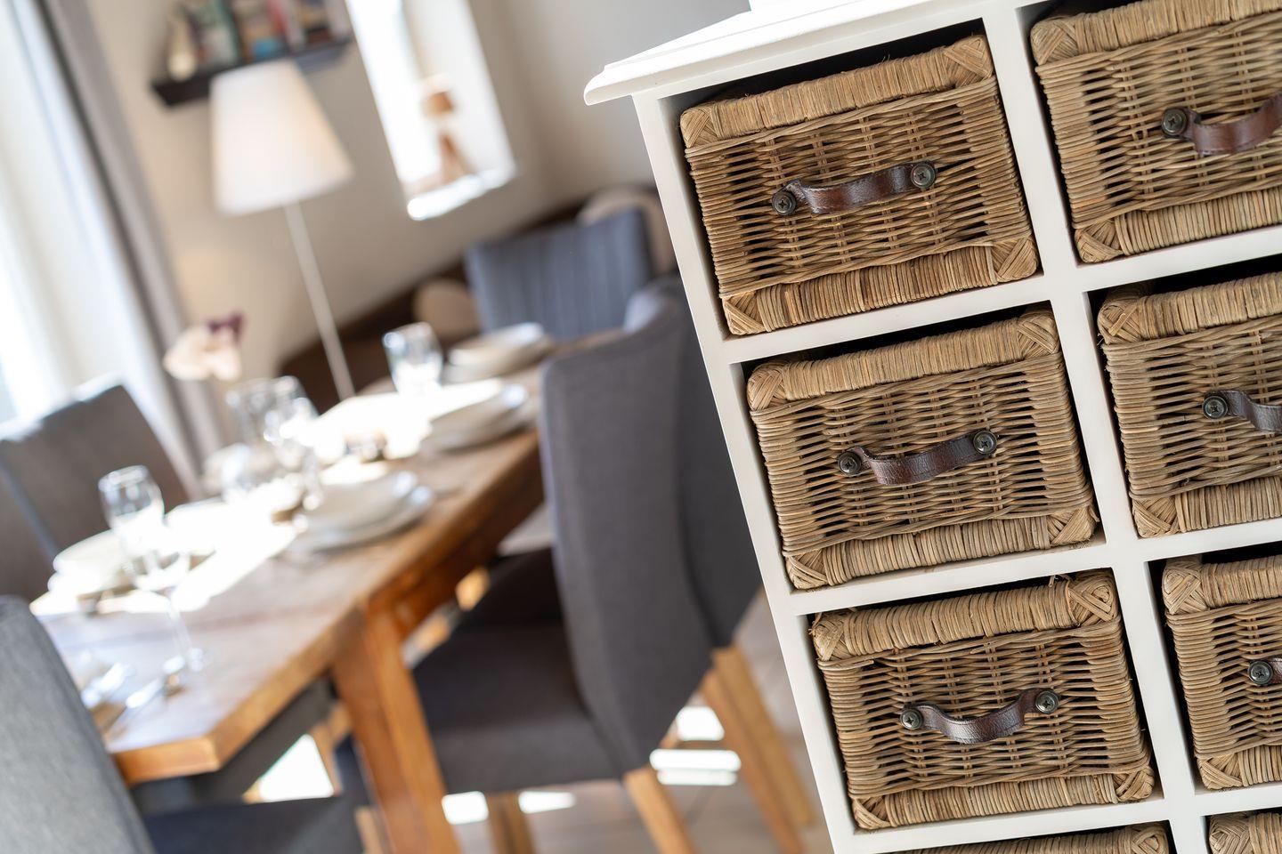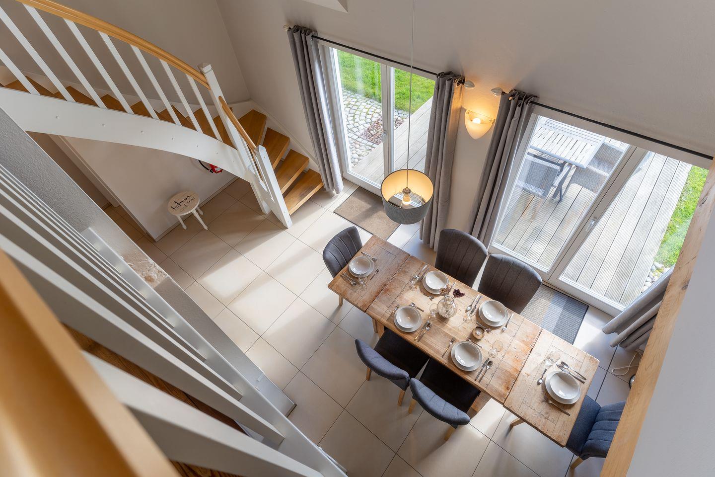 Die Friesenhaushälfte ist mit einem großen gefliesten Wohnraum mit offener Galerie ausgestattet. Hier befindet sich ein großer Esstisch, eine gemütliche Eckcouch mit Sessel sowie die offene, voll ausgestattete Einbauküche (inkl. Kaffeemaschine, Toaster, Wasserkocher, Backofen, Gefrierschrank, Cerankochfeld, Dunstabzugshaube, Geschirrspüler, Eierkocher, Staubsauger, Bügeleisen, Wäschegestell).