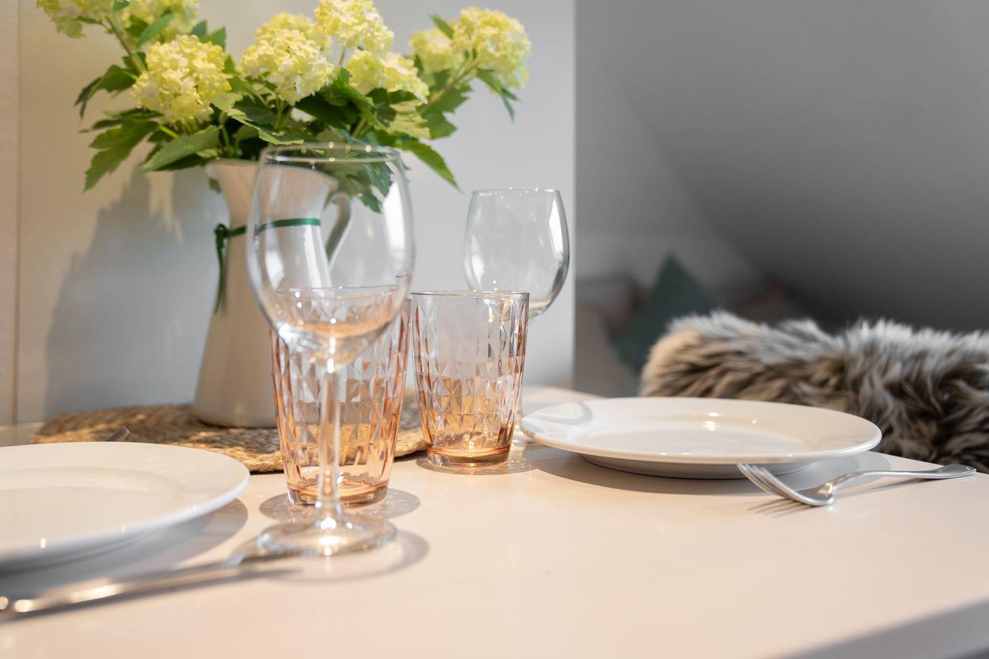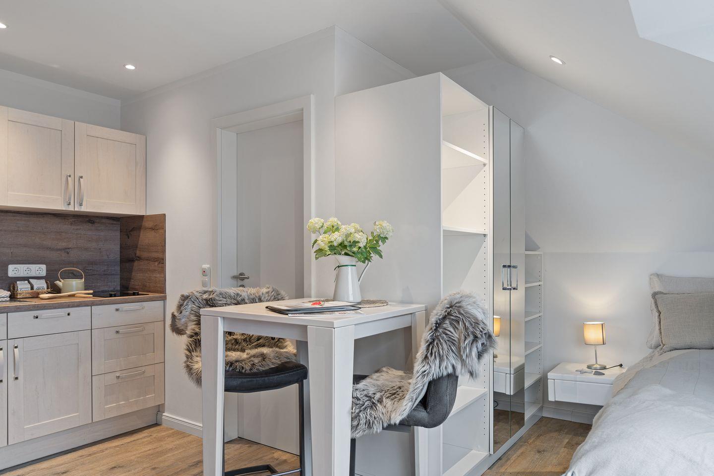 Klein und gemütlich ist diese Wohnung im 2. Obergeschoss. Idealer Ausgangspunkt, um zu Zweit alle Vorteile des Strandlebens von St. Peter-Ording zu genießen. Die Ferienwohnung im 2 Obergeschoss mit ca. 30qm bietet Ihnen ein gemütliches Wohnzimmer. Hier erwartet Sie eine Couch sowie Couchtisch. Des weiteren ist ein Esstisch mit 2 Stühlen vorhanden. Die Küche der Wohnung ist voll ausgestattet mit einem Cerankochfeld mit Backofen, Dunstabzugshaube, Geschirr, Kaffeemaschine, Kochtöpfe, Kühlschrank, Toaster und einem Wasserkocher.
