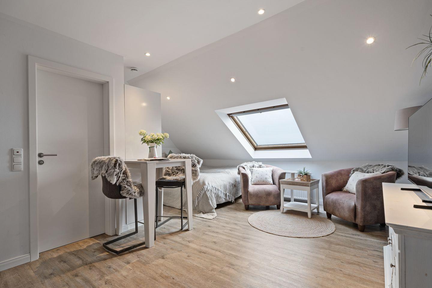Als Schlafmöglichkeit dient ein Doppelbett. Des weiteren ist eine Kommode sowie Kleiderschrank vorhanden. Das Badezimmer mit Dusche, Waschbecken und WC. Zur Unterhaltung dient ein Sat-TV Flachbildschirm, Radio sowie WLAN (inklusive). Im Erdgeschoss befindet sich ein Fahrradabstellraum. Dieser kann von allen Feriengästen genutzt werden.