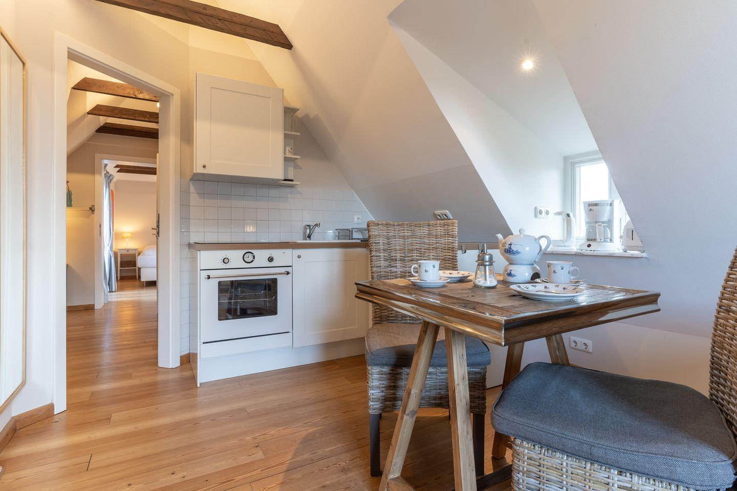Die Dachterrassenwohnung wird aufgrund Ihrer Größe und Ausstattung auch liebevoll "Kuschelnest" genannt. Sie befindet sich im Obergeschoss der rechten Haushälfte und ist über eine Holztreppe erreichbar. Sie hat einen kombinierten Wohnraum mit Sofa, Essecke, kleiner Einbauküche (Backofen mit 4-Plattenherd, Kühlschrank mit Gefrierfach, Kaffeemaschine, Wasserkocher, Toaster etc.) und kleiner Abstellkammer.