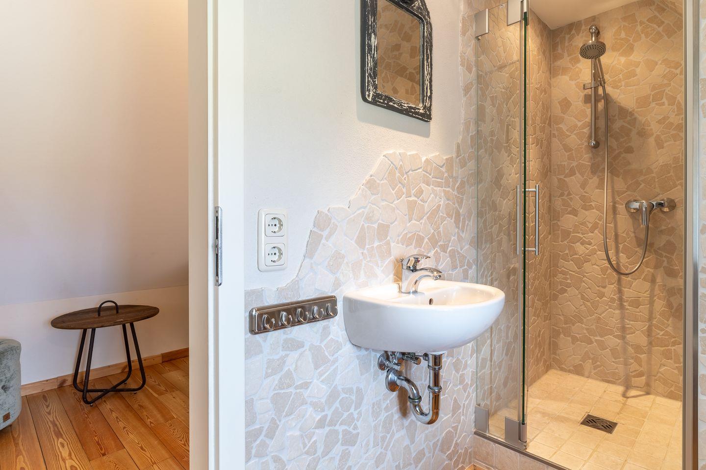 Das Schlafzimmer verfügt über ein 1,60 m breites Boxspringbett (2x 80er Matratzen), einen Balkon zum Deich und hat nach hinten einen herrlichen Blick auf die Marschen. Das Duschbad mit WC ist mit Bruchsteinen gefliest, was diesem Bad unter dem Dach einen besonderen Charme verleiht. Wohnraum und Schlafzimmer sind über ein kleineres Durchgangszimmer, das weiteren Stauraum bietet, miteinander verbunden.